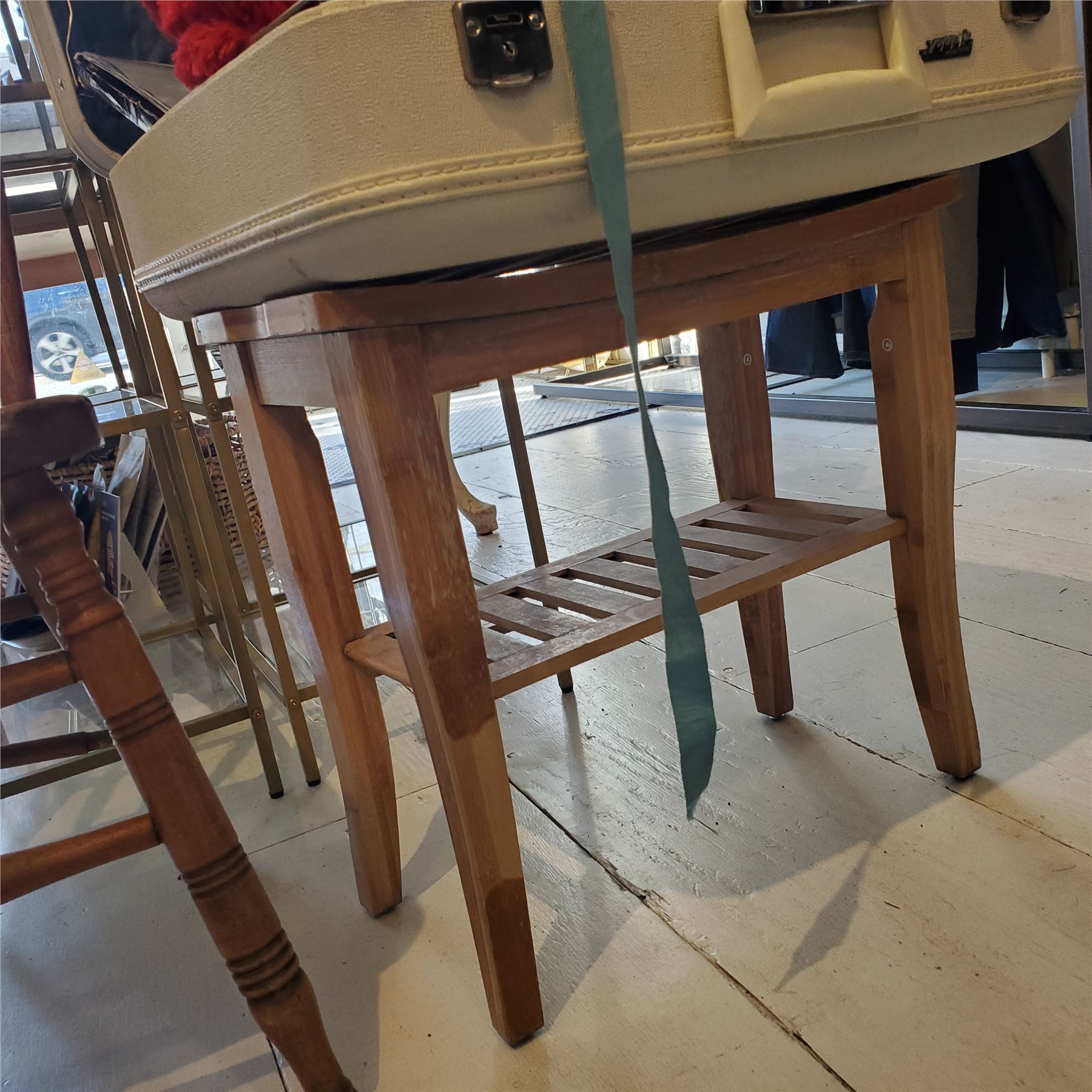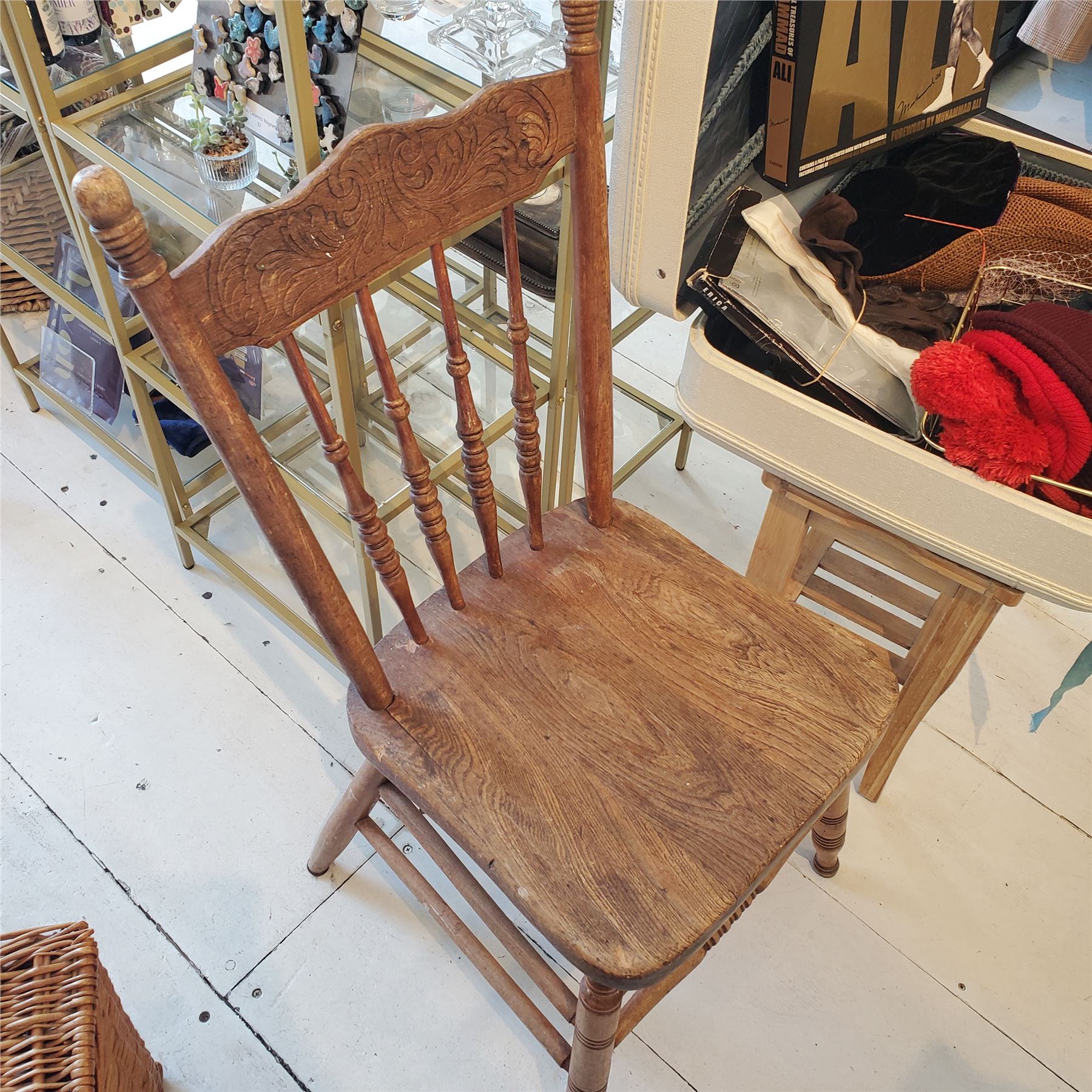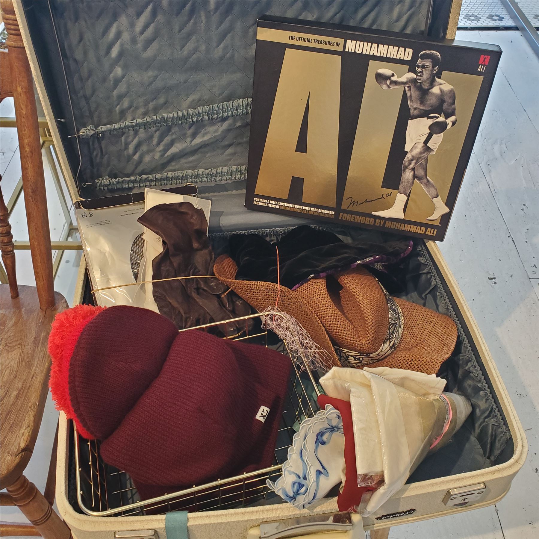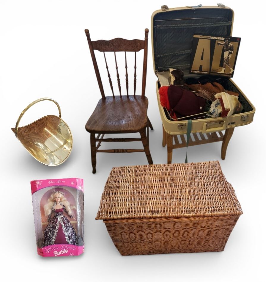 Vintage group of Rattan Basket, Suitcases w/ Accessories Contents & Wooden Stool