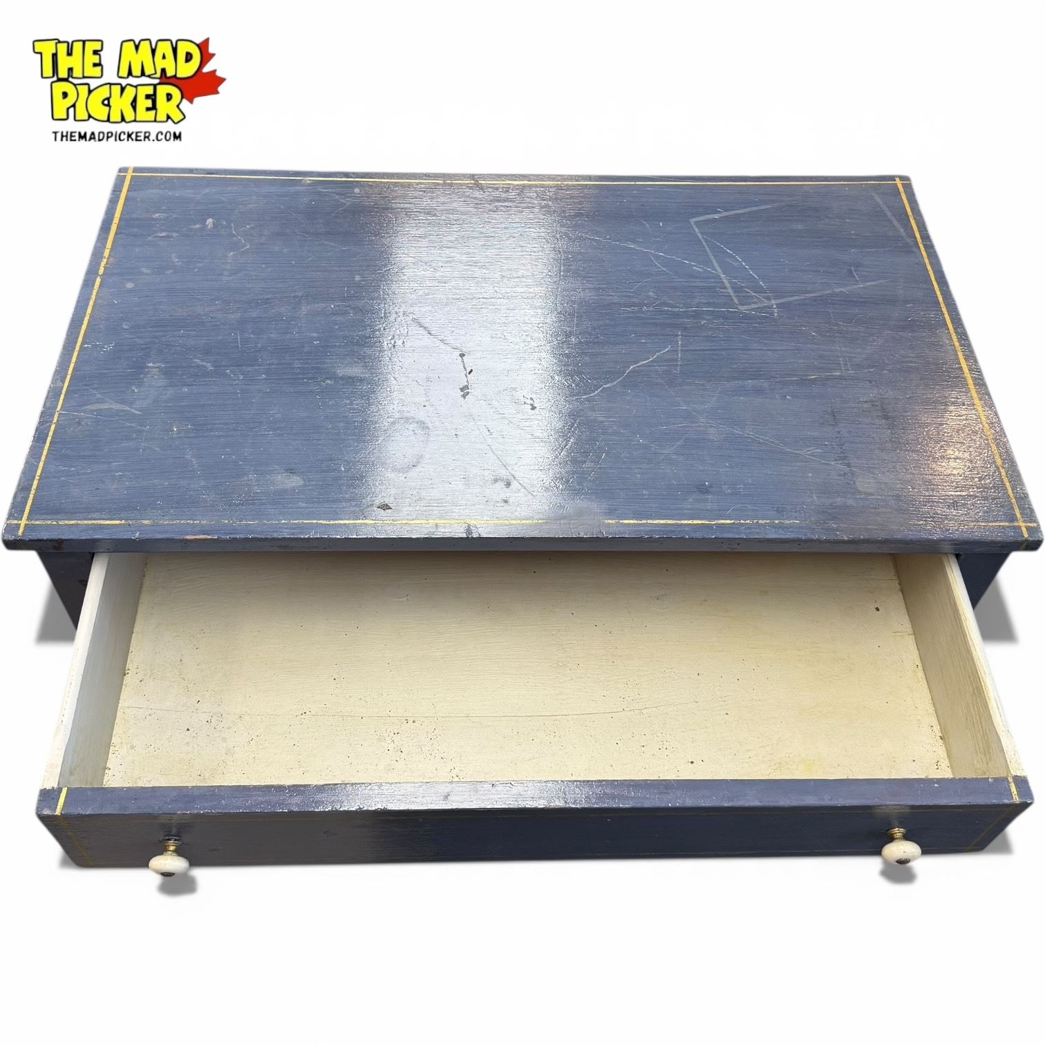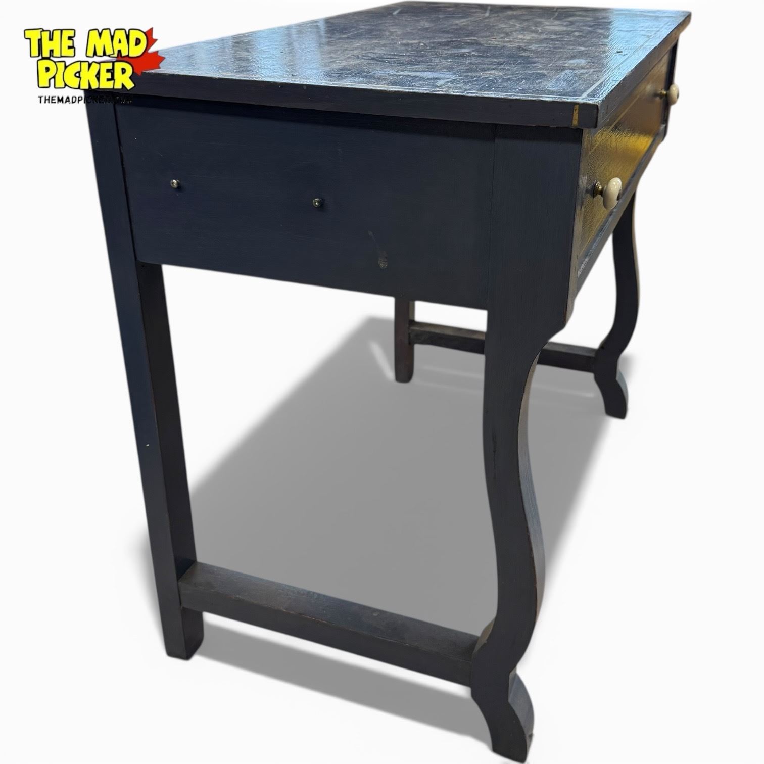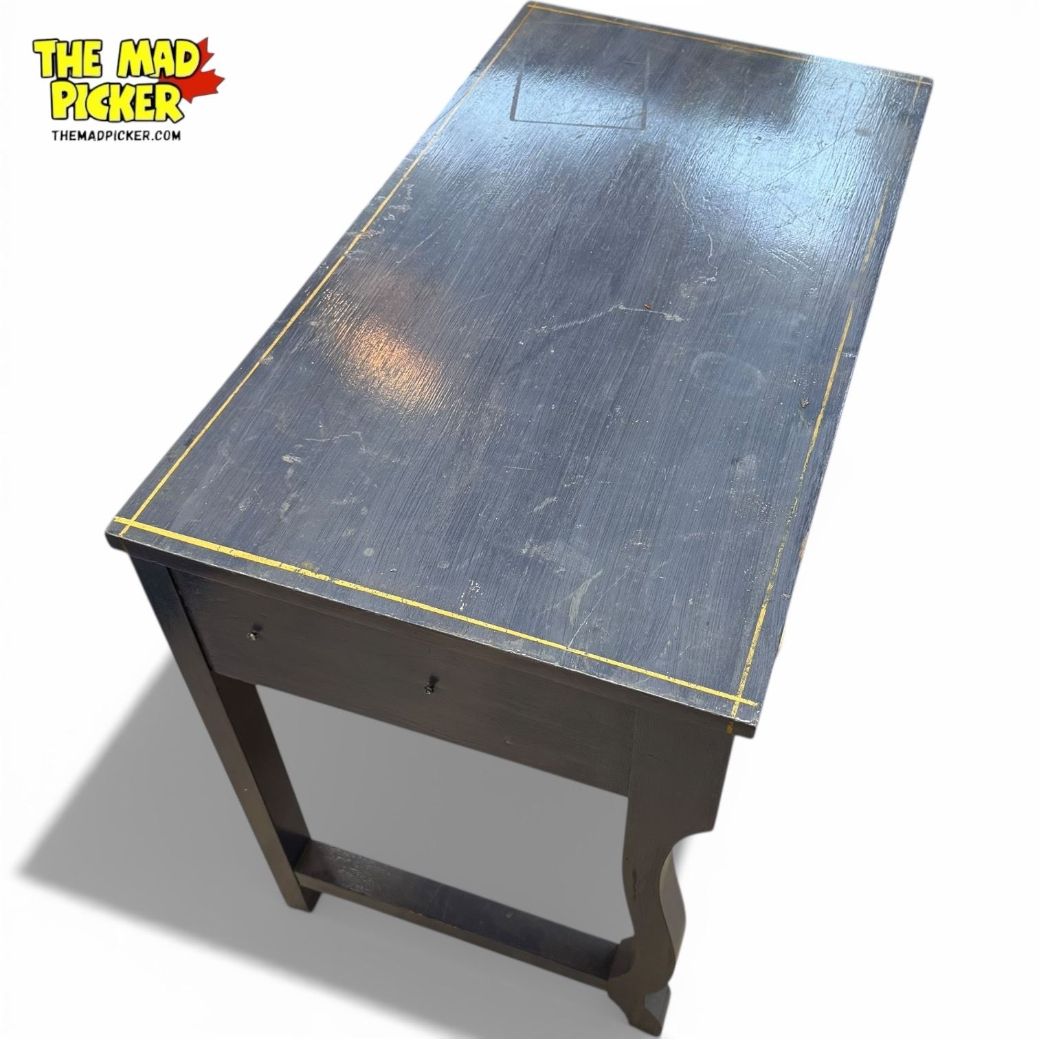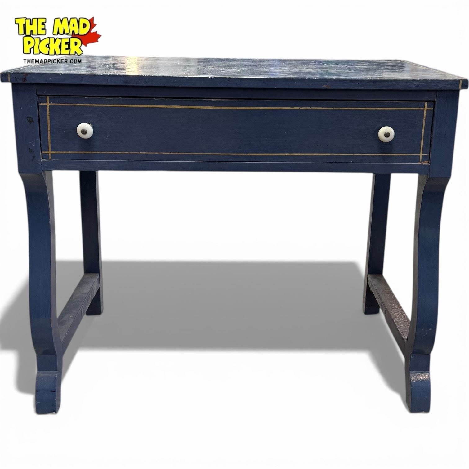 Dark blue desk in vintage style, featuring a single drawer with white round pulls and a gold pinstripe accent on the apron. Rectangular top supported by distinctive curved saber legs. Dimensions: 34 inches wide, 19 inches deep, 25.5 inches tall. Suitable as a side table or writing desk.