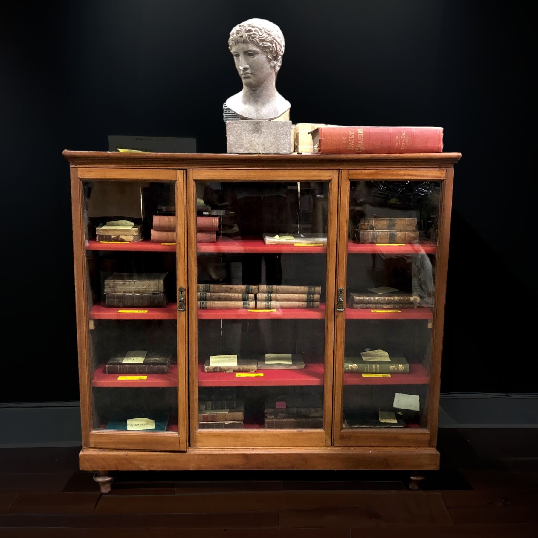 Vintage wooden bookshelf display cabinet w/ glass doors - approx 51" W x 12 1/2" L x 48" H