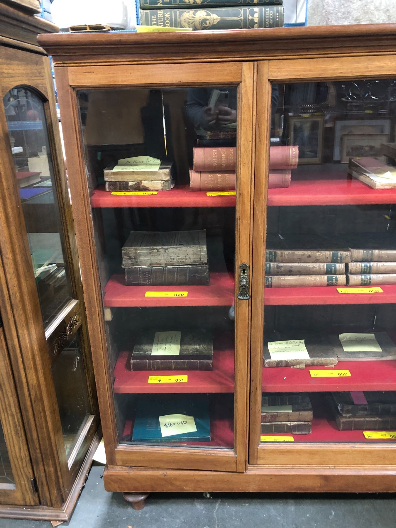 Vintage wooden bookshelf display cabinet w/ glass doors - approx 51  W x 12 1/2  L x 48  H