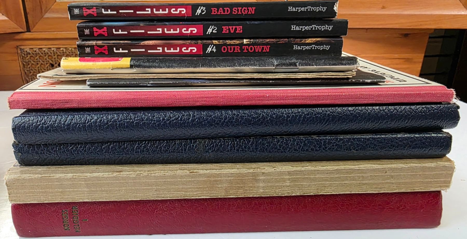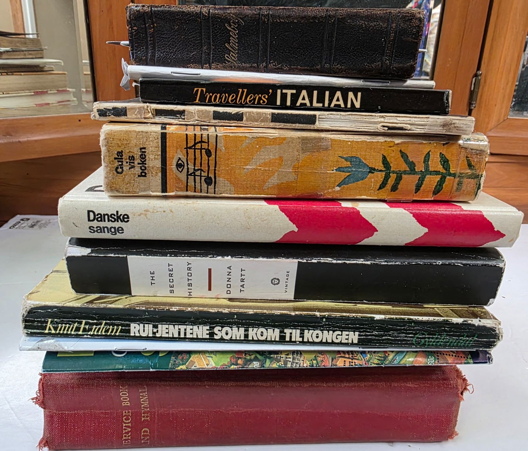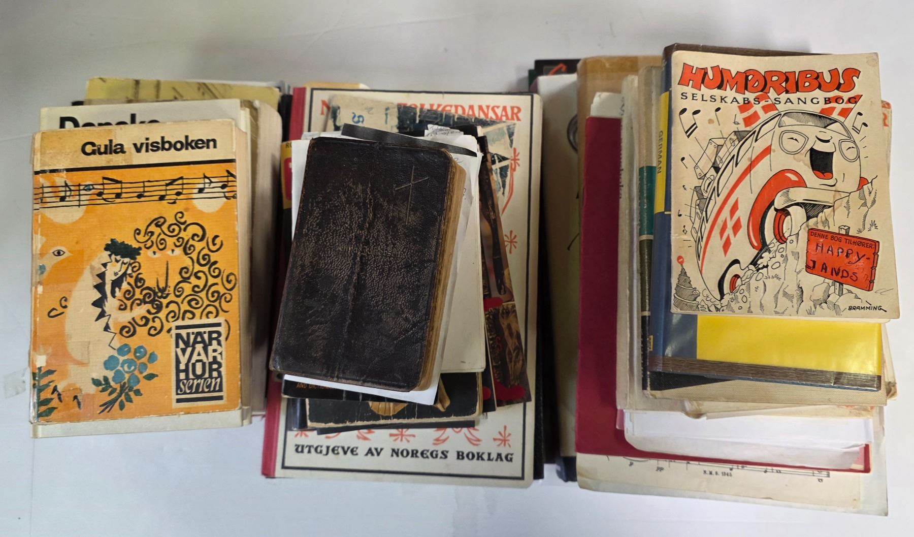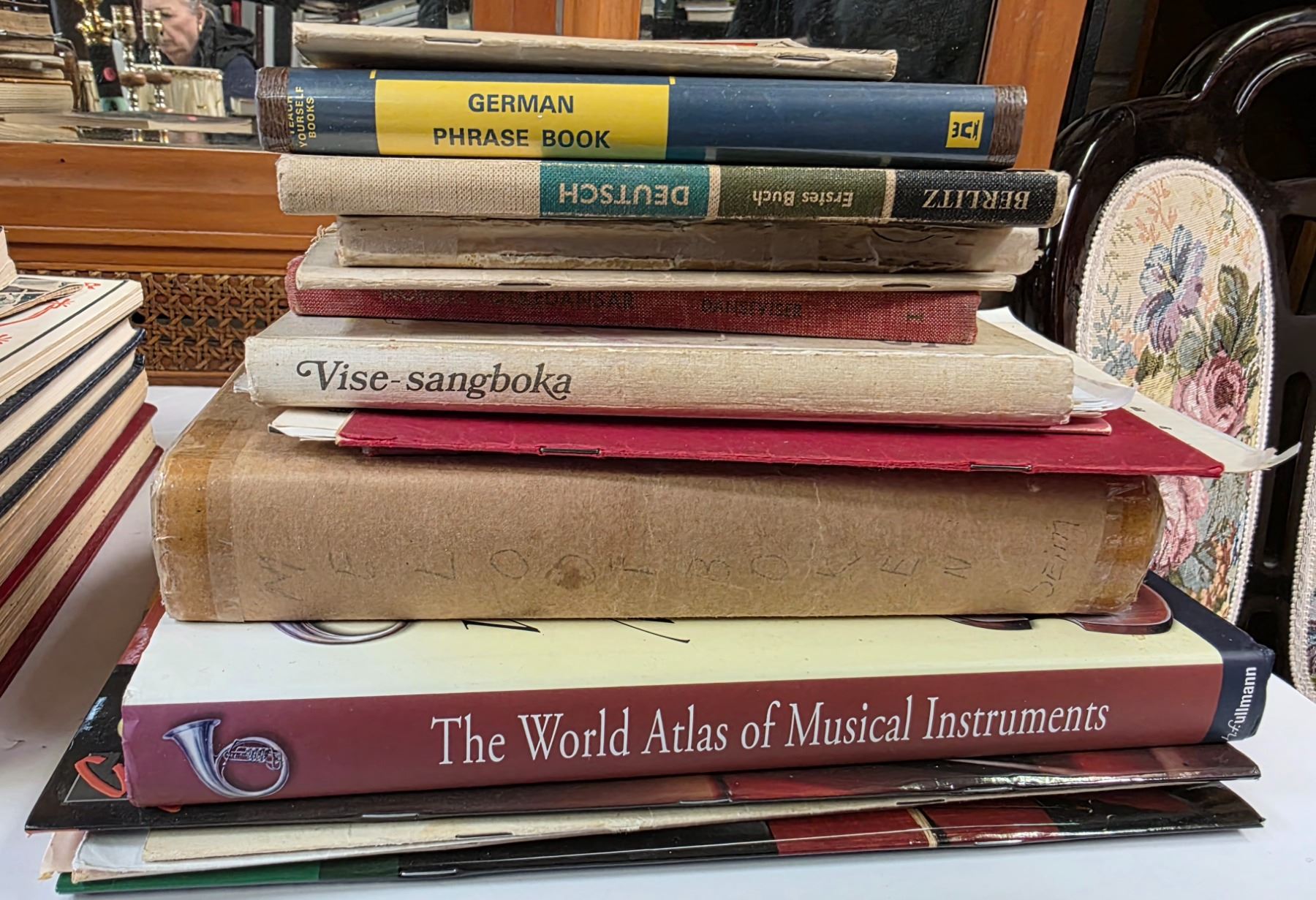 Violin Shoulder Rest, & 3 Stacks of Vintage Norwegian, German & Other Music Books and Novels