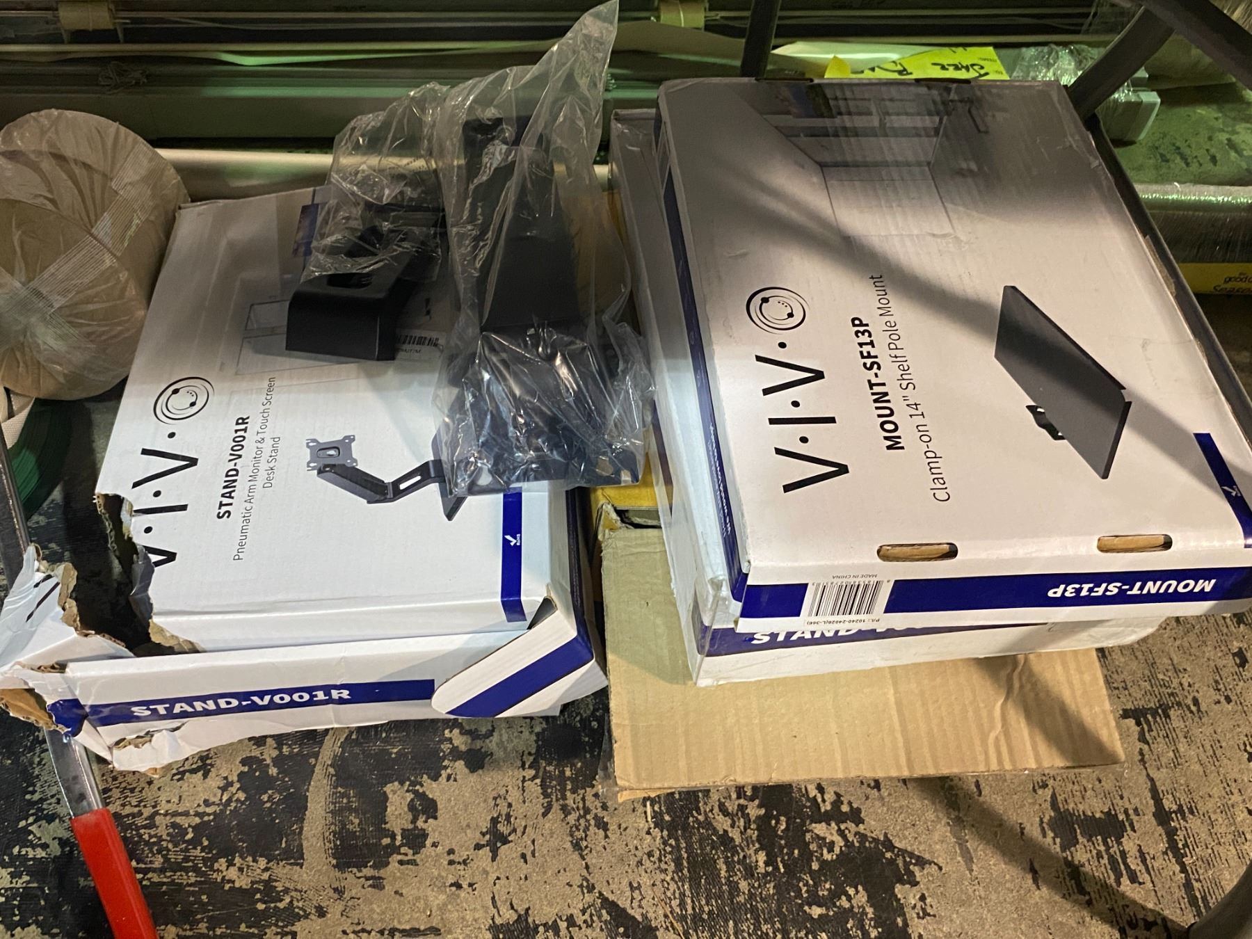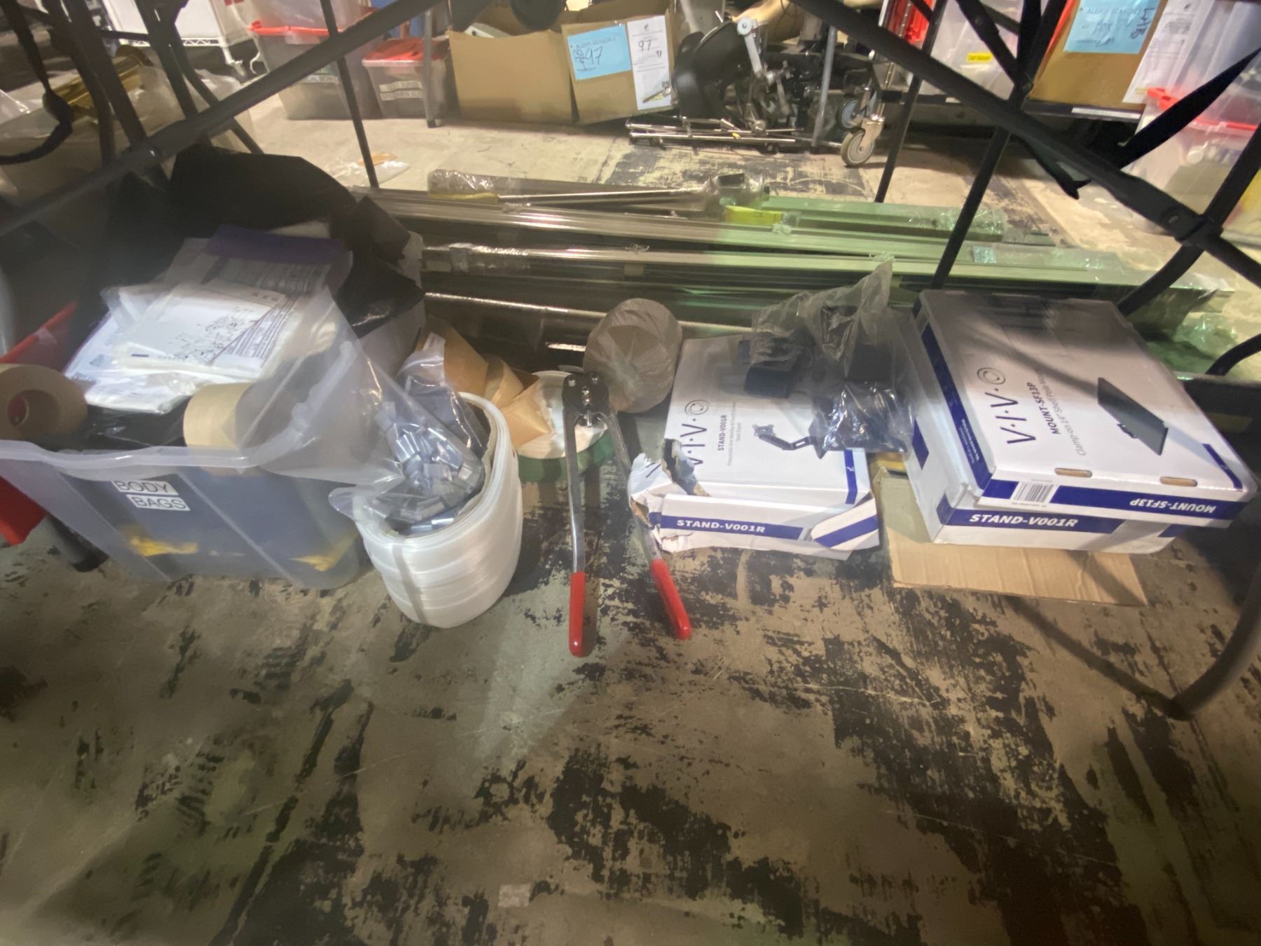 Vivo TV Mount Stands with Hardware, Pallet Strapping Kit, and Tote of Black Body Bags