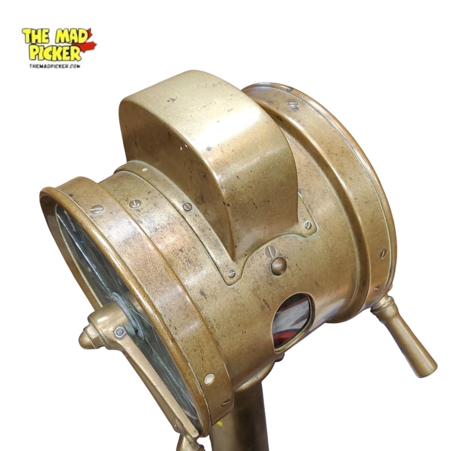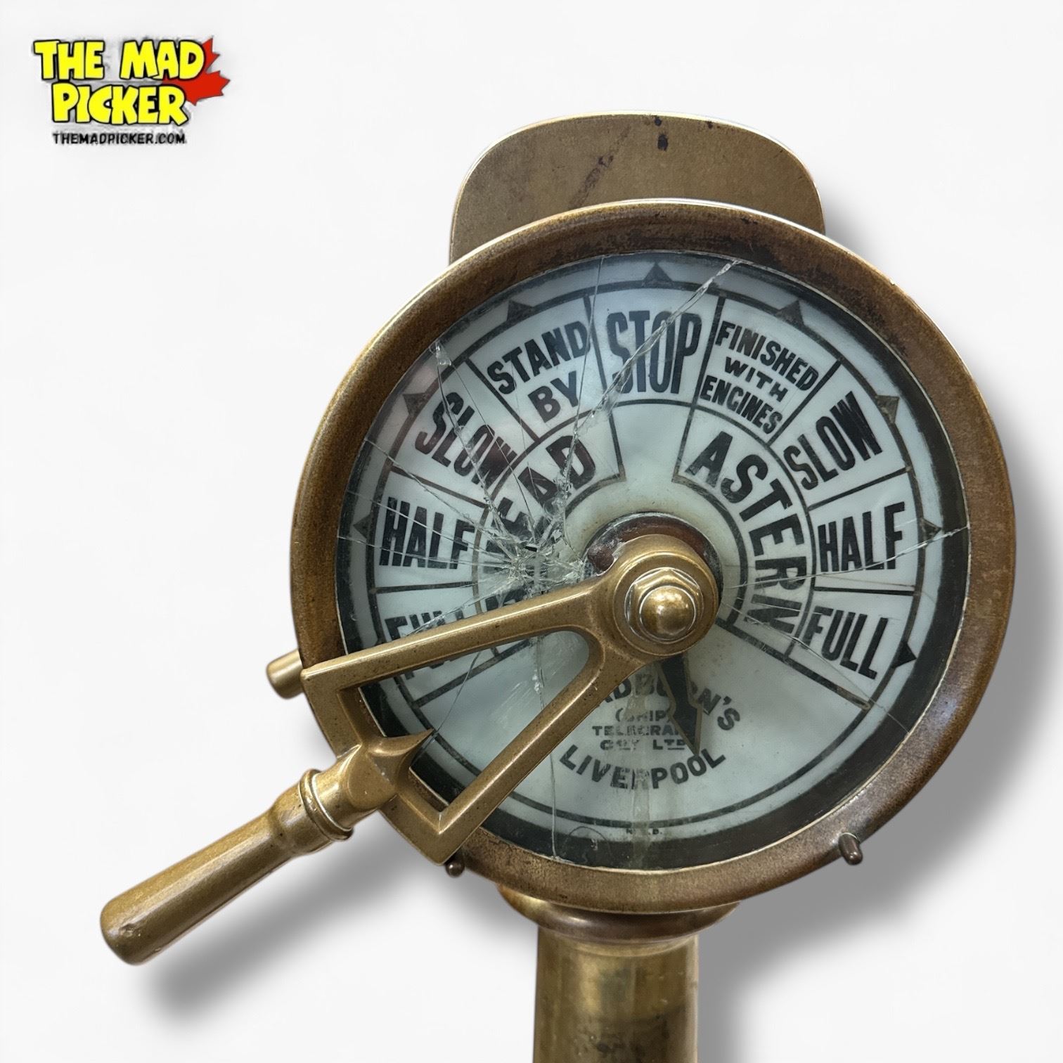Constructed entirely of heavy marine-grade brass, the telegraph features dual indicator faces, mechanical linkage hardware, and the classic command positions used aboard Allied naval vessels of the era. Both indicator screens show period-consistent cracking, a condition that reflects decades of operational use and adds authenticity without diminishing the instrument's display presence. The patina, wear patterns, and mechanical components all present as genuine and untouched, offering collectors a true piece of working naval history.