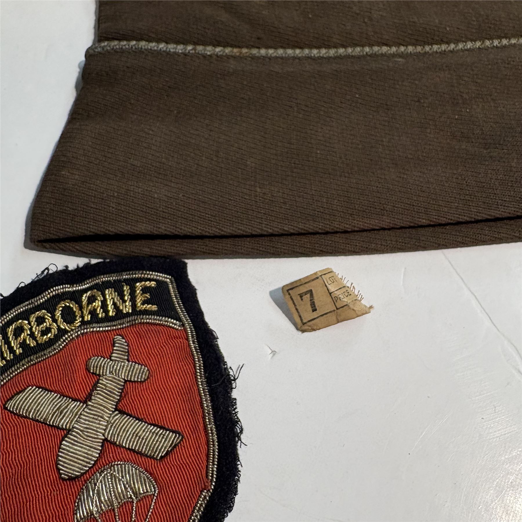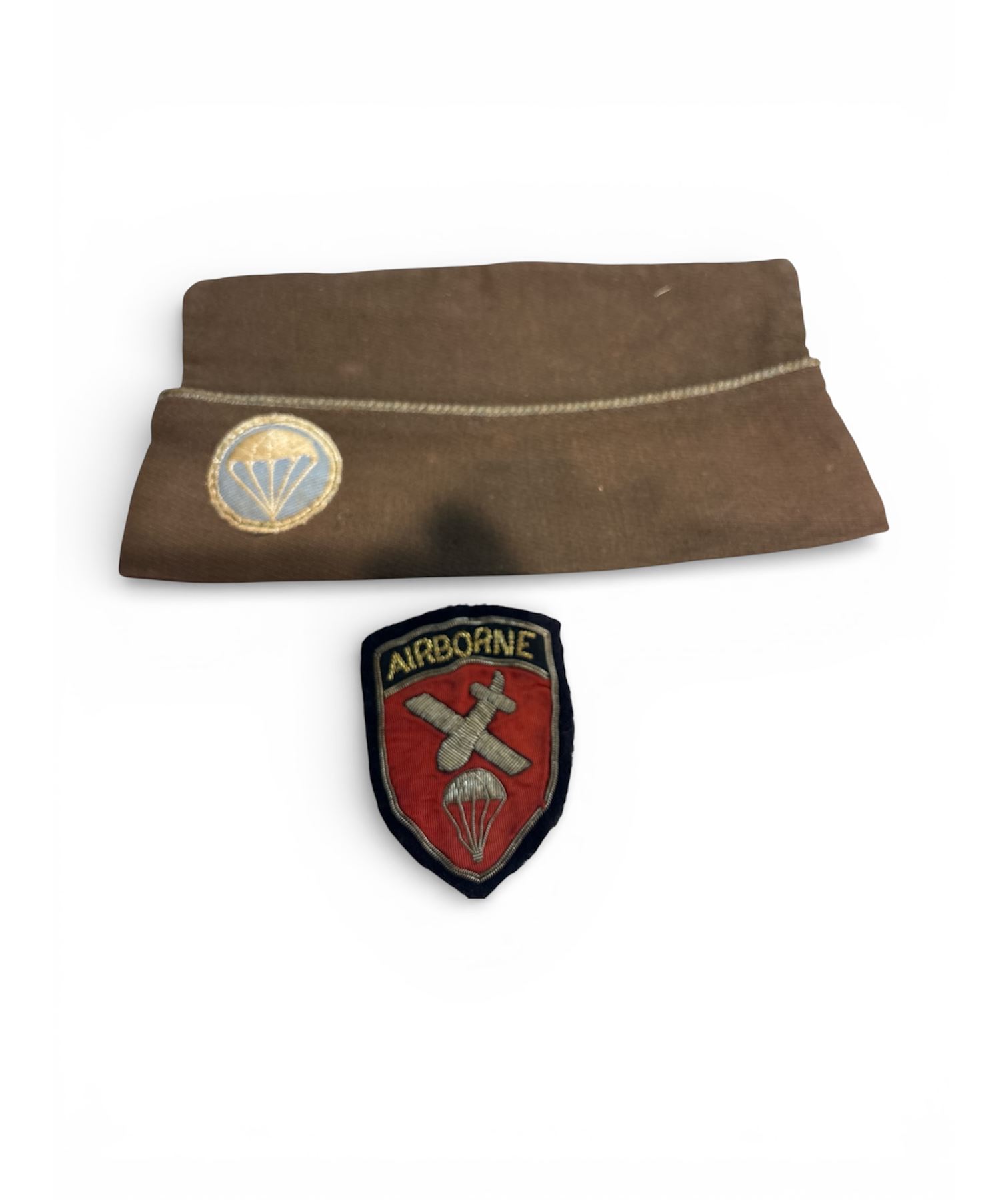 World War II US Army Airborne paratrooper garrison overseas cap in size 7 with accompanying 1943 101st Airborne Division patch. Cap features standard military design of the era. Patch displays eagle logo associated with the division. Historical WWII memorabilia as pictured.
