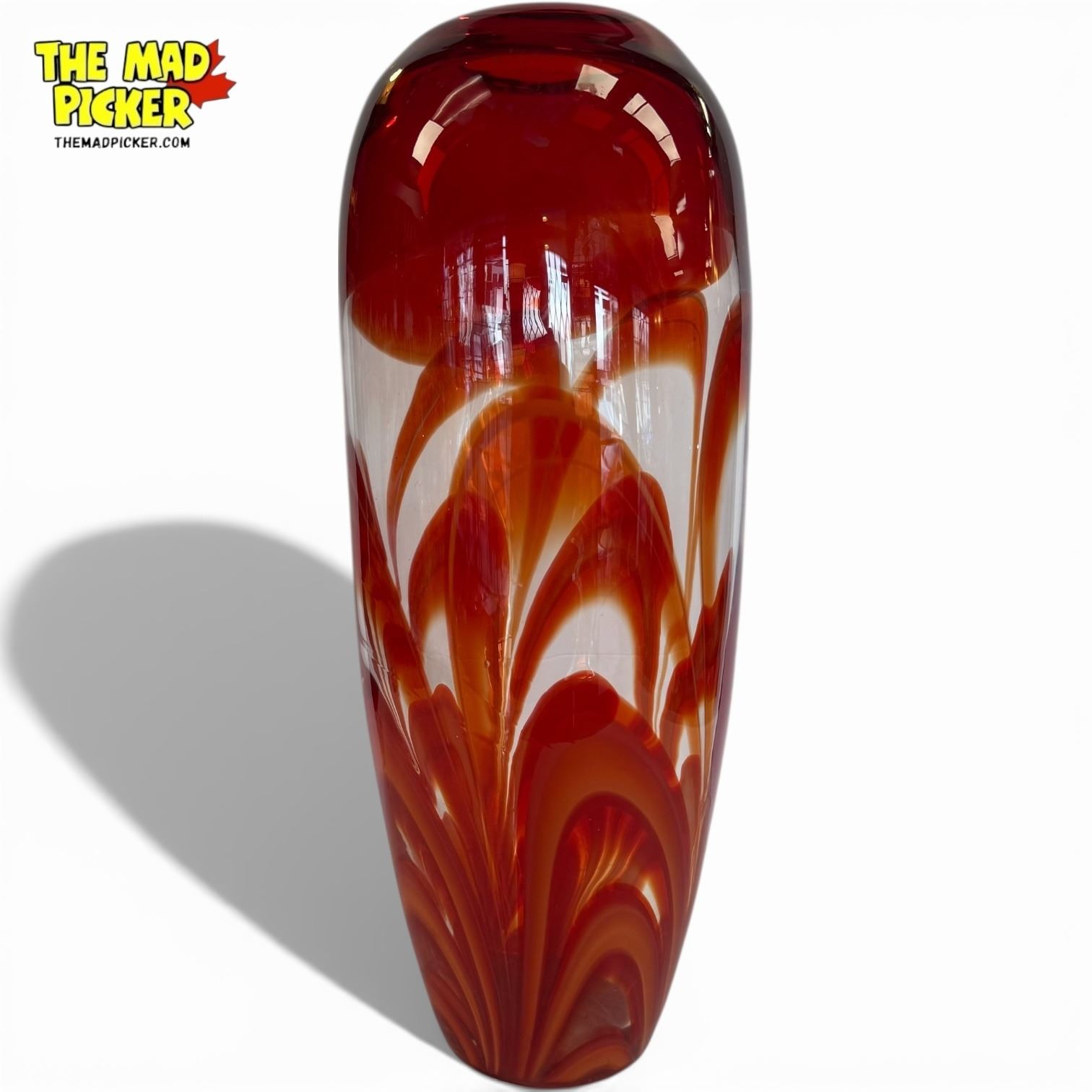 Waterford Evolution art glass vase featuring a red and amber feather swirl pattern. Model known as 'Ginger'. Measures 14.5 inches in height. Part of the Evolution series, known for vibrant designs inspired by natural elements. Signed on base. Produced in the late 20th to early 21st century.