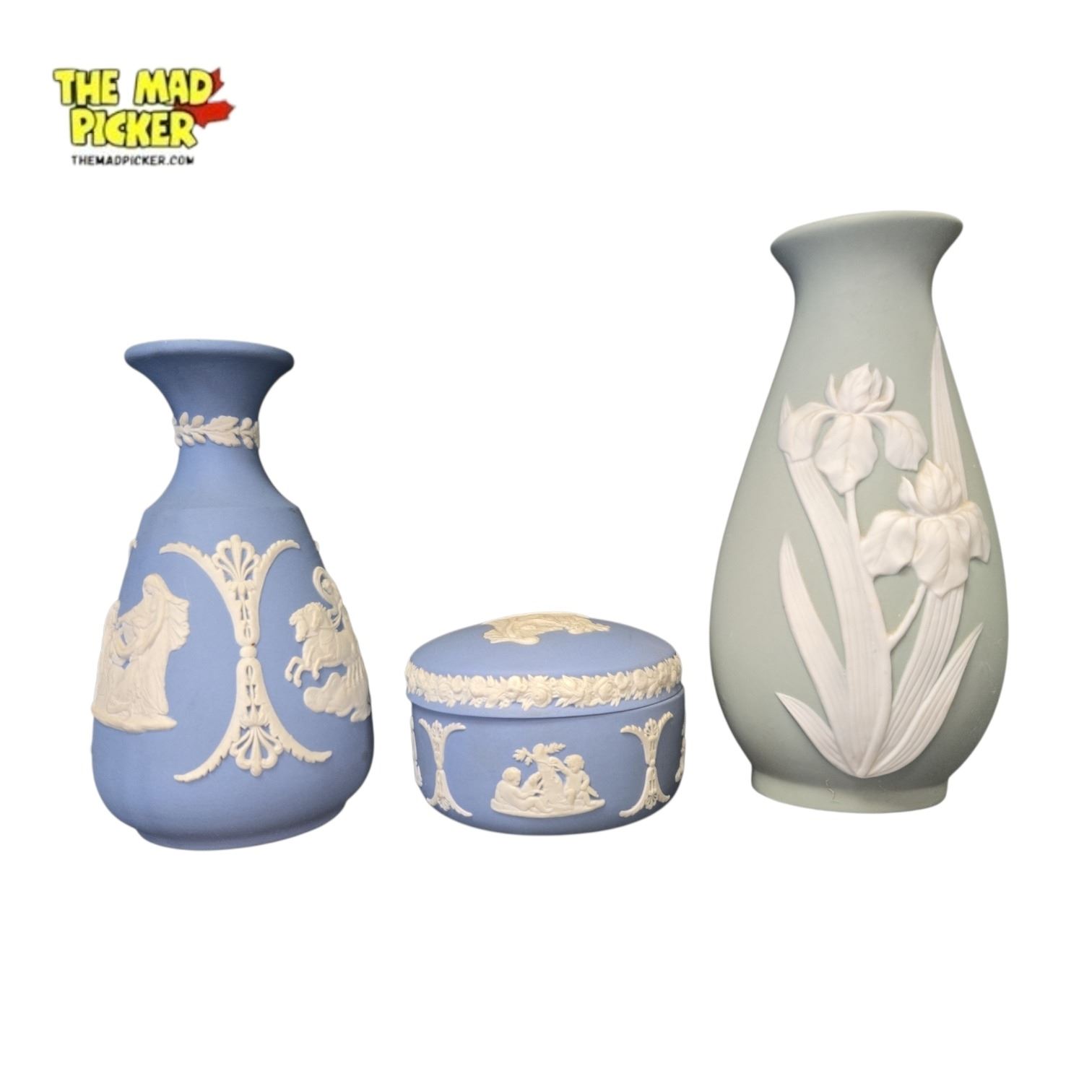 Set includes a Wedgwood small ceramic vase and matching small container, along with a 6-inch tall Flambro porcelain vase. Wedgwood items are in classic design, while the Flambro vase features traditional porcelain craftsmanship. Specific colors or patterns not provided.