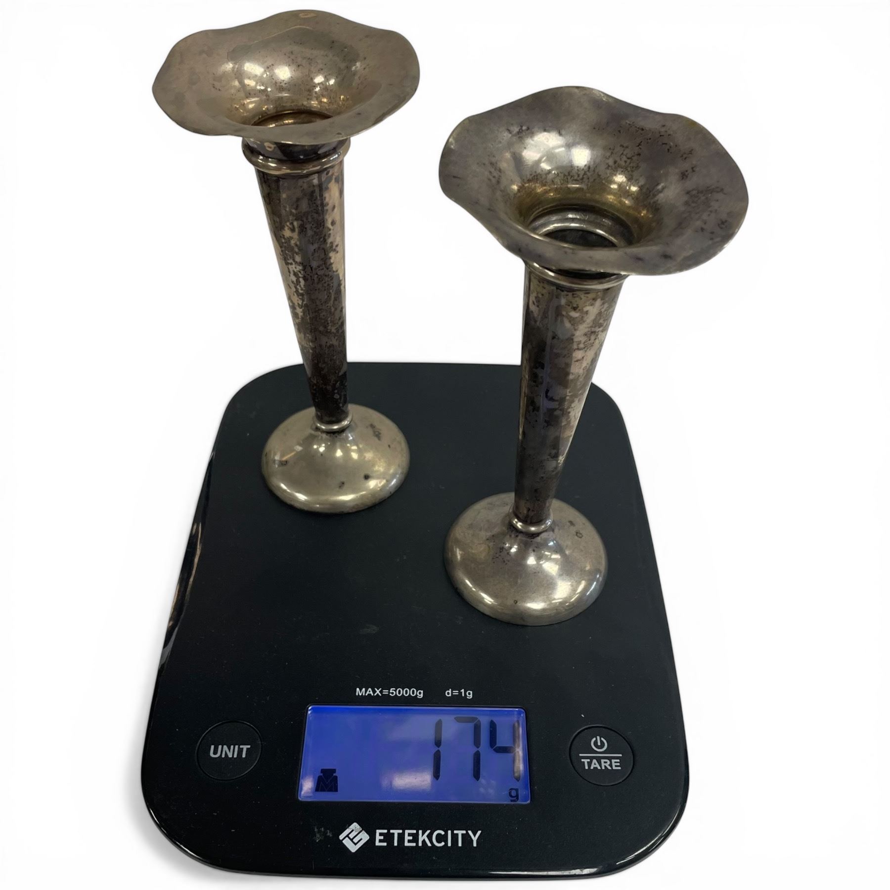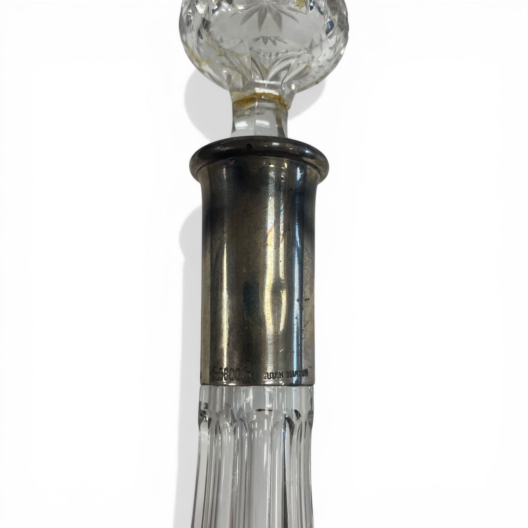 2 Unmarked Weighted Silver Bud Vases & 1 Antique Crystal Decanter with .800 Silver Band (Decanter is 10" tall x 3.5" diameter)