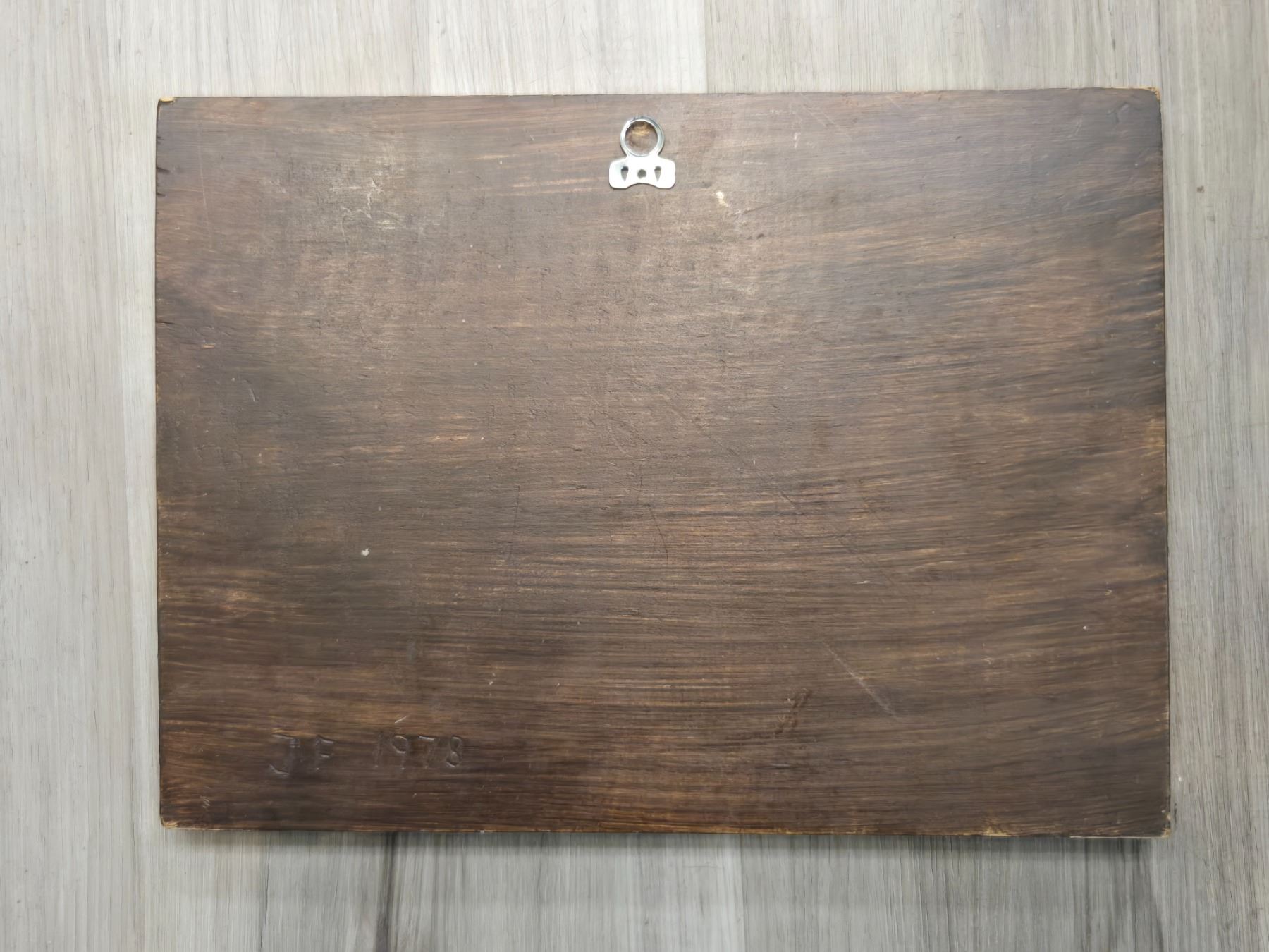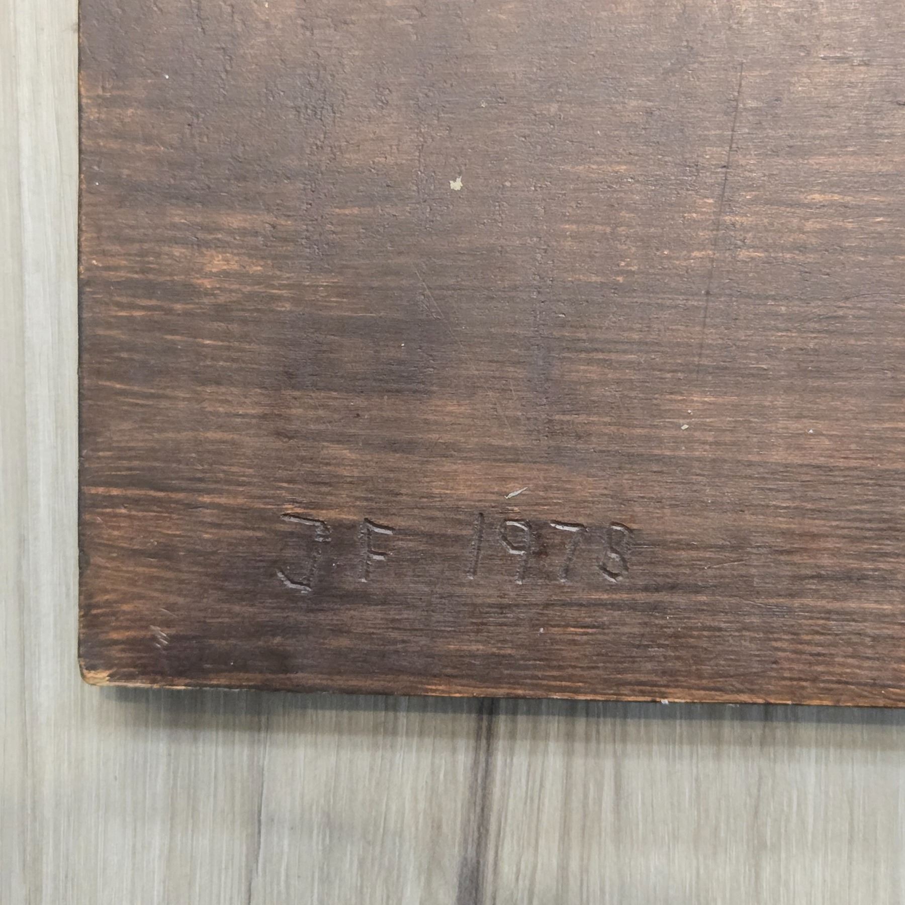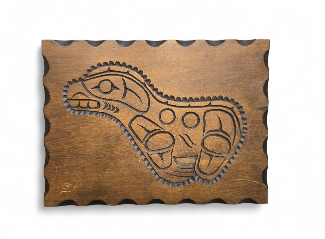 West Coast First Nations carved wood relief plaque featuring a seal design. Hand-signed by artist JF and dated 1978. Measures 11.5x8.5-Inch. Item showcases traditional First Nations artistic motifs and craftsmanship. Item is as pictured.