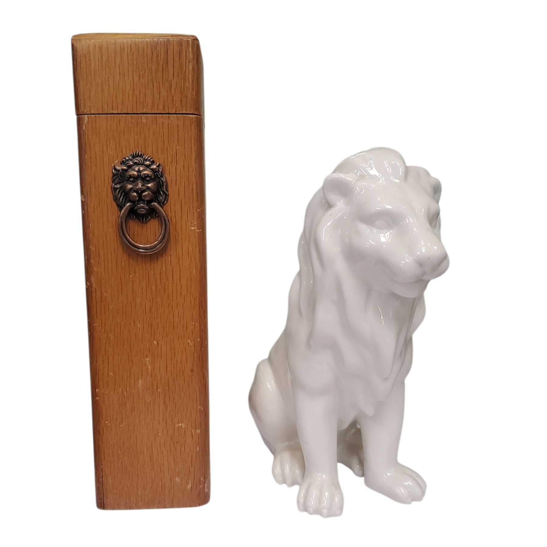 Set includes a 10-inch white ceramic lion piggy bank and a wooden matchbox featuring a brass lion head door knocker decoration. The piggy bank represents a regal lion design, while the brass knocker adds vintage-inspired charm. Both items combine functional and decorative qualities.