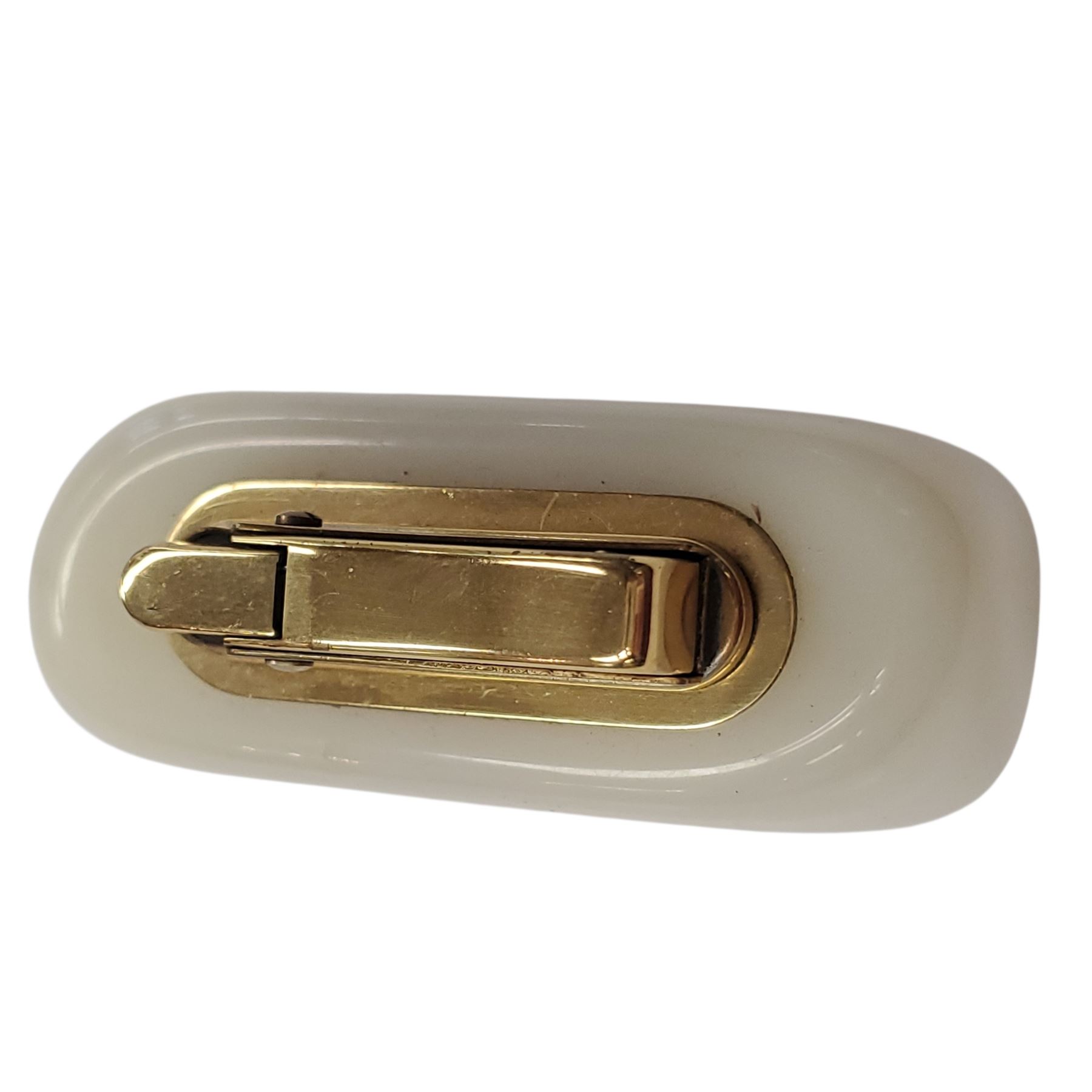 Vintage white onyx table lighter featuring a CHB brass mechanism. Manufactured in Germany. The lighter showcases a polished white onyx base combined with a brass mechanism for striking and ignition. Commonly produced mid-20th century, it captures a blend of functional and decorative appeal.