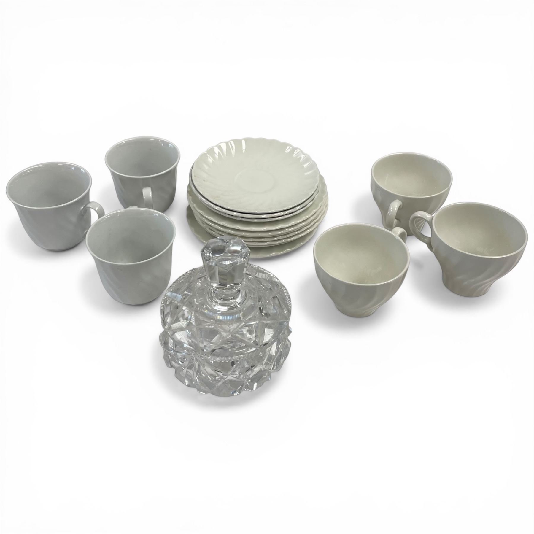 White Swirl Coffee Cup Set and Cut Glass Candy Dish