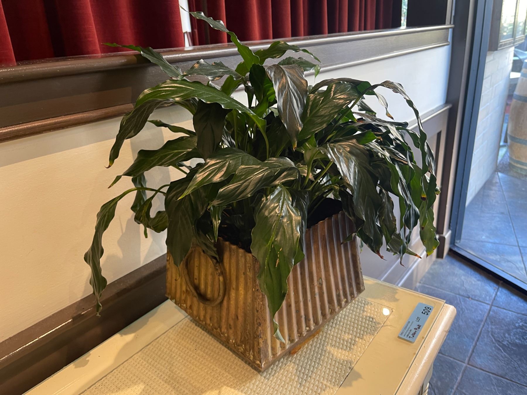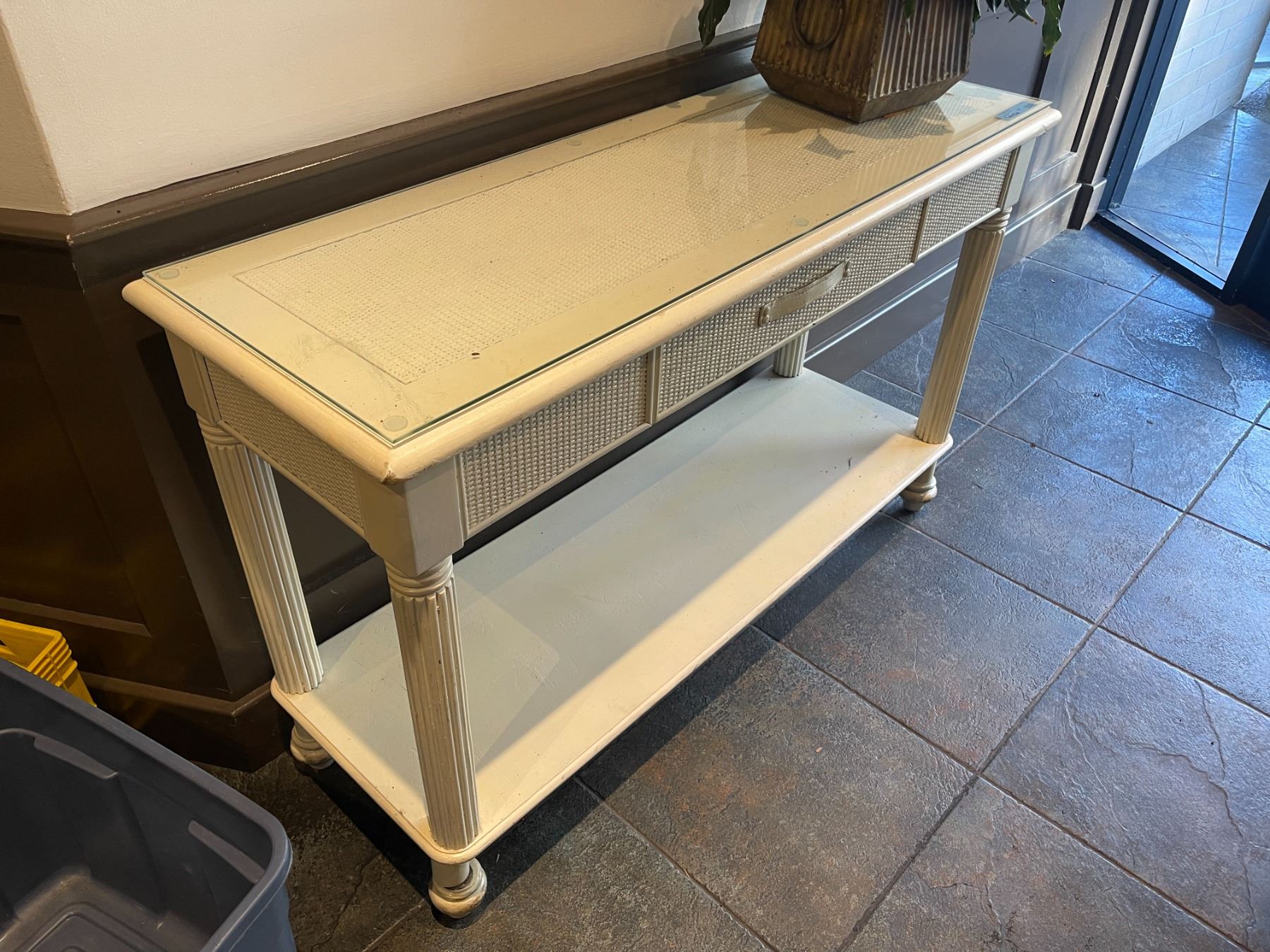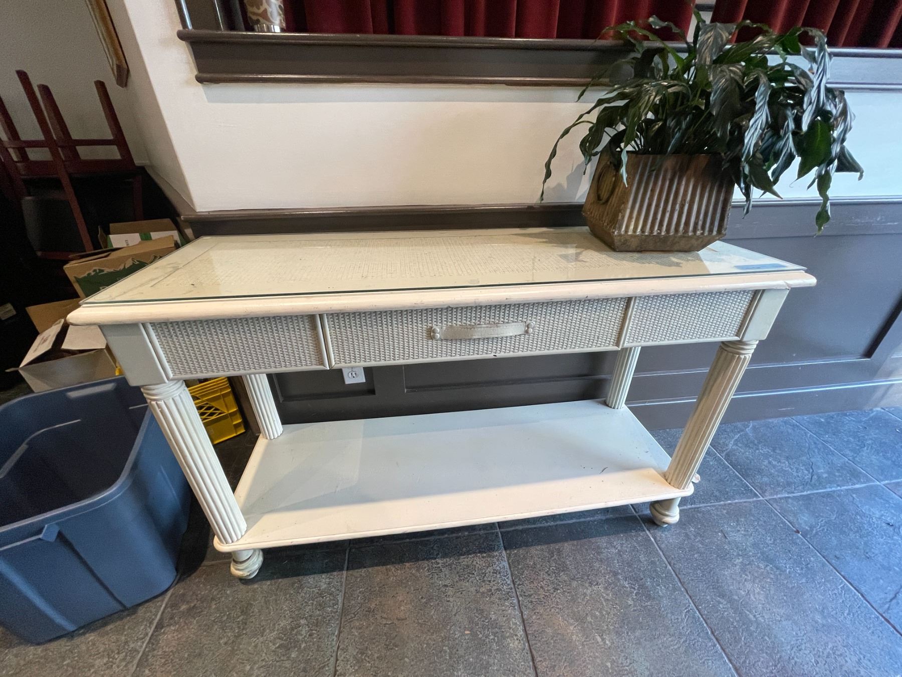 White side table w/ glass top & faux plant