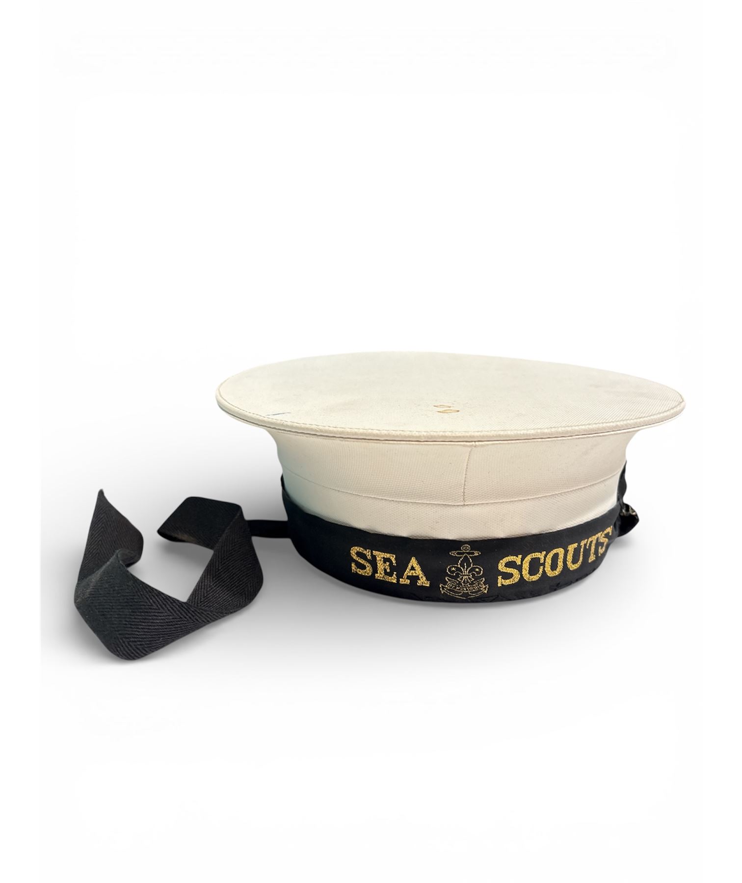 William Skully Sea Scouts hat in size 6 5/8. Made from navy wool, designed as part of the official Sea Scouts uniform. Features traditional styling complete with structured design and sewn-on insignia details typical of historical scouting attire. Item is as pictured.
