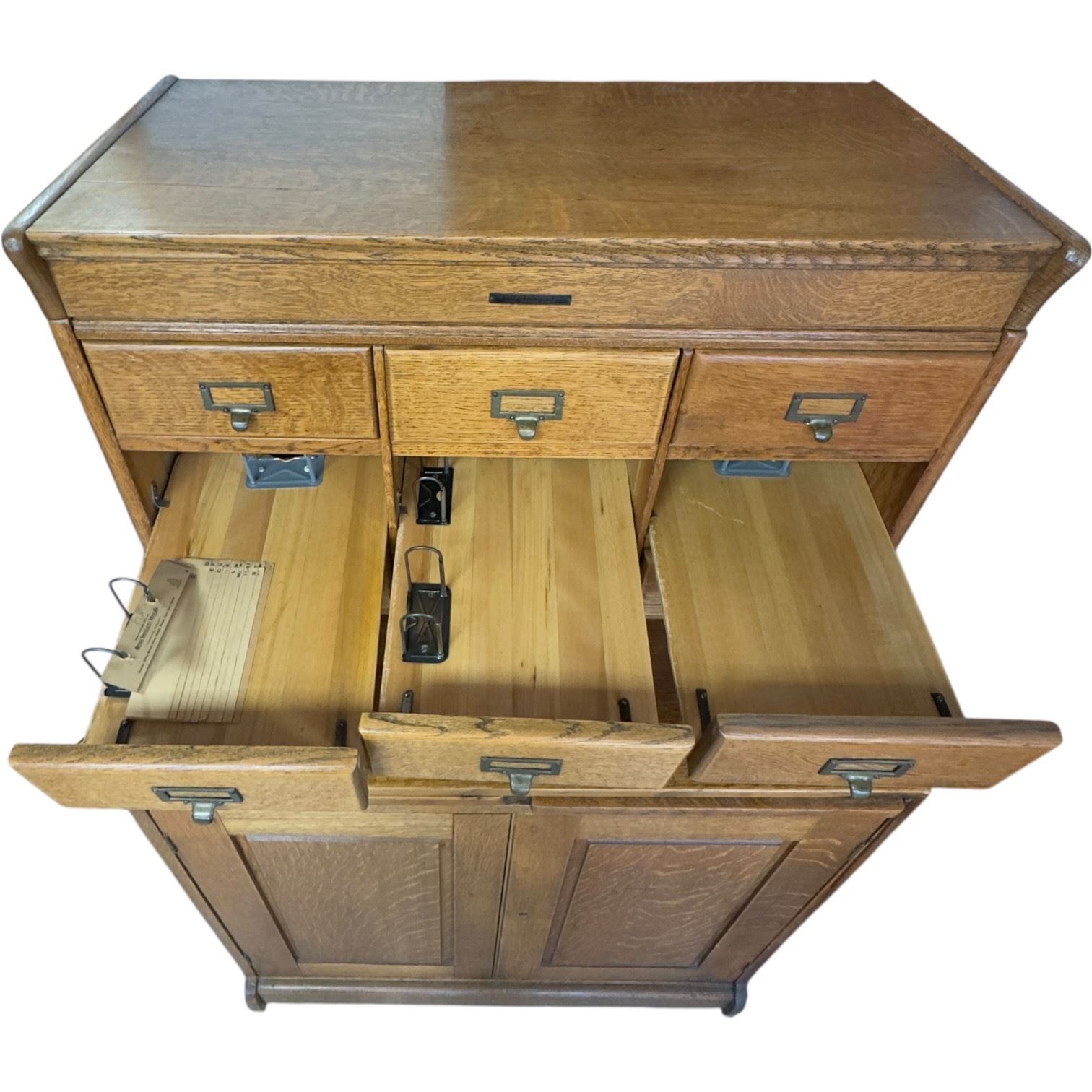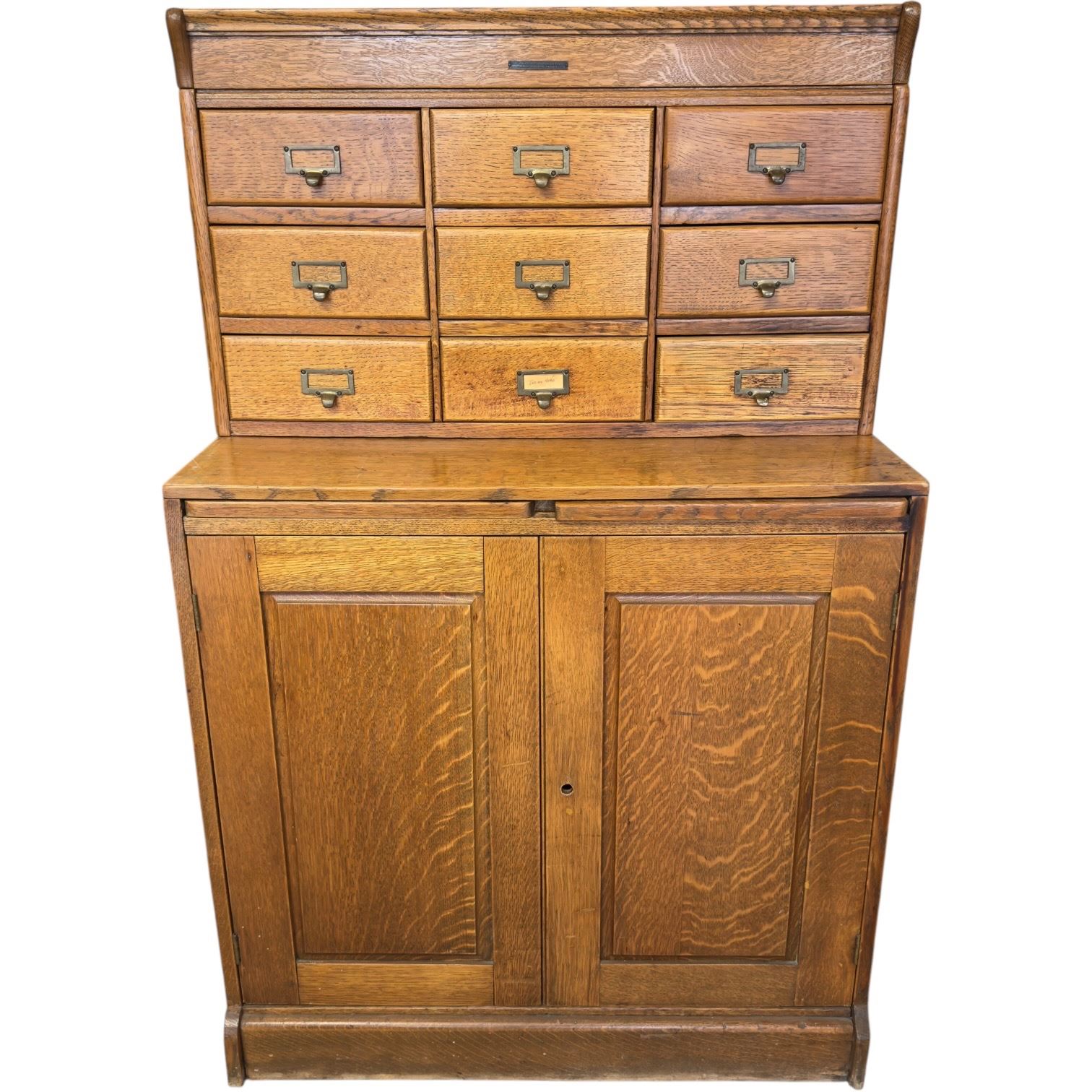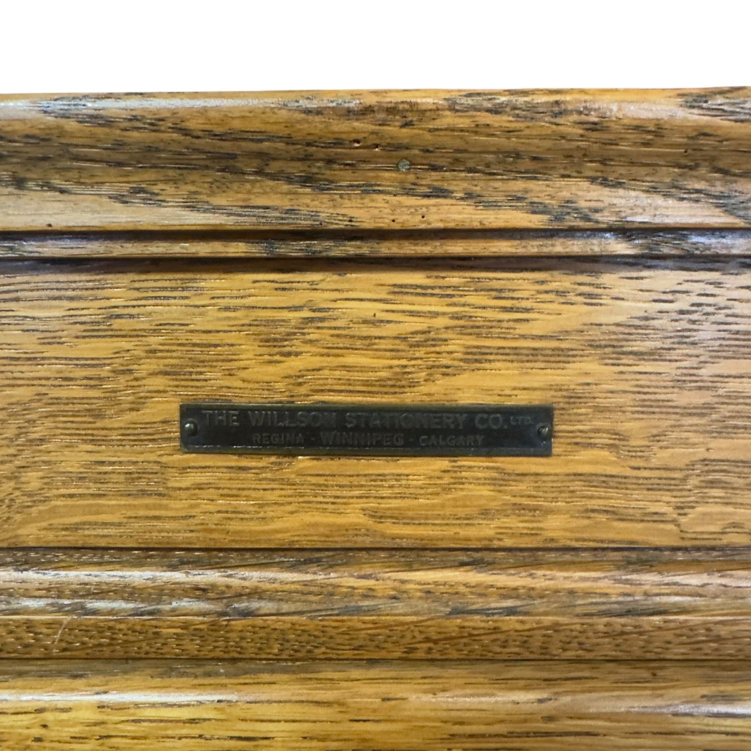 Wilson Stationary Company solid oak filing cabinet with two-piece design. Features pull-out writing platforms, multiple cabinets and drawers. Includes dimensions of 34x25x53.5 inches. Crafted from durable oak wood for functional storage and organization. Item is as pictured.