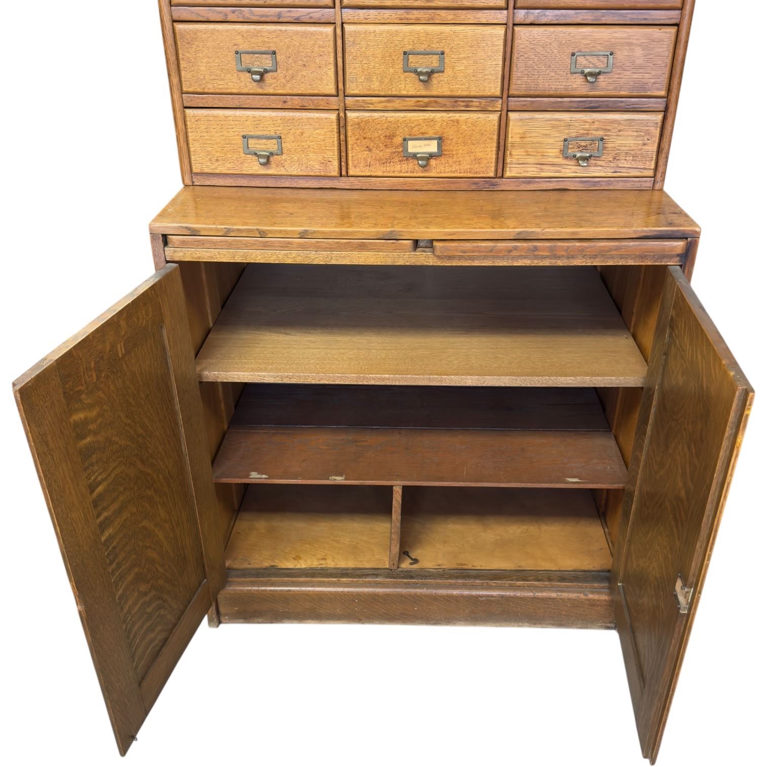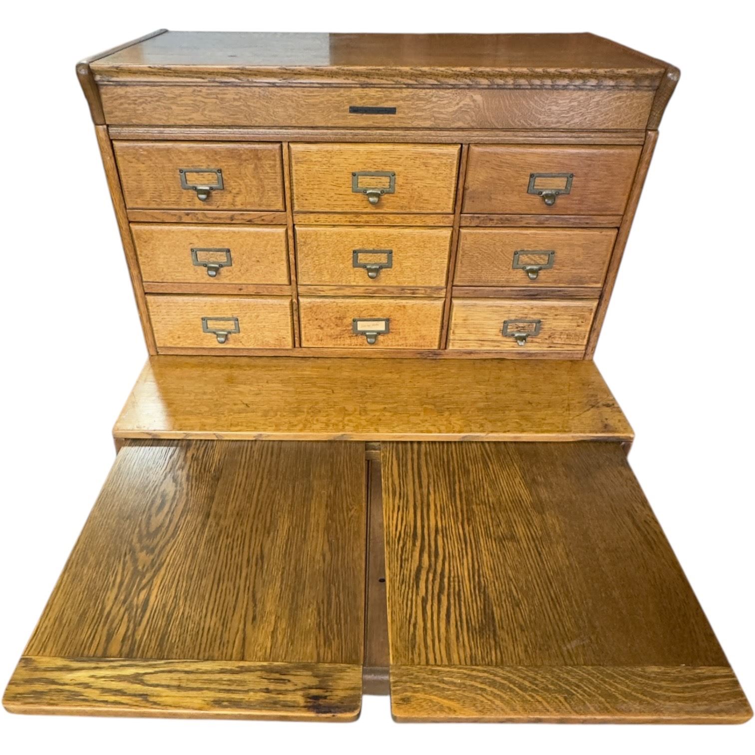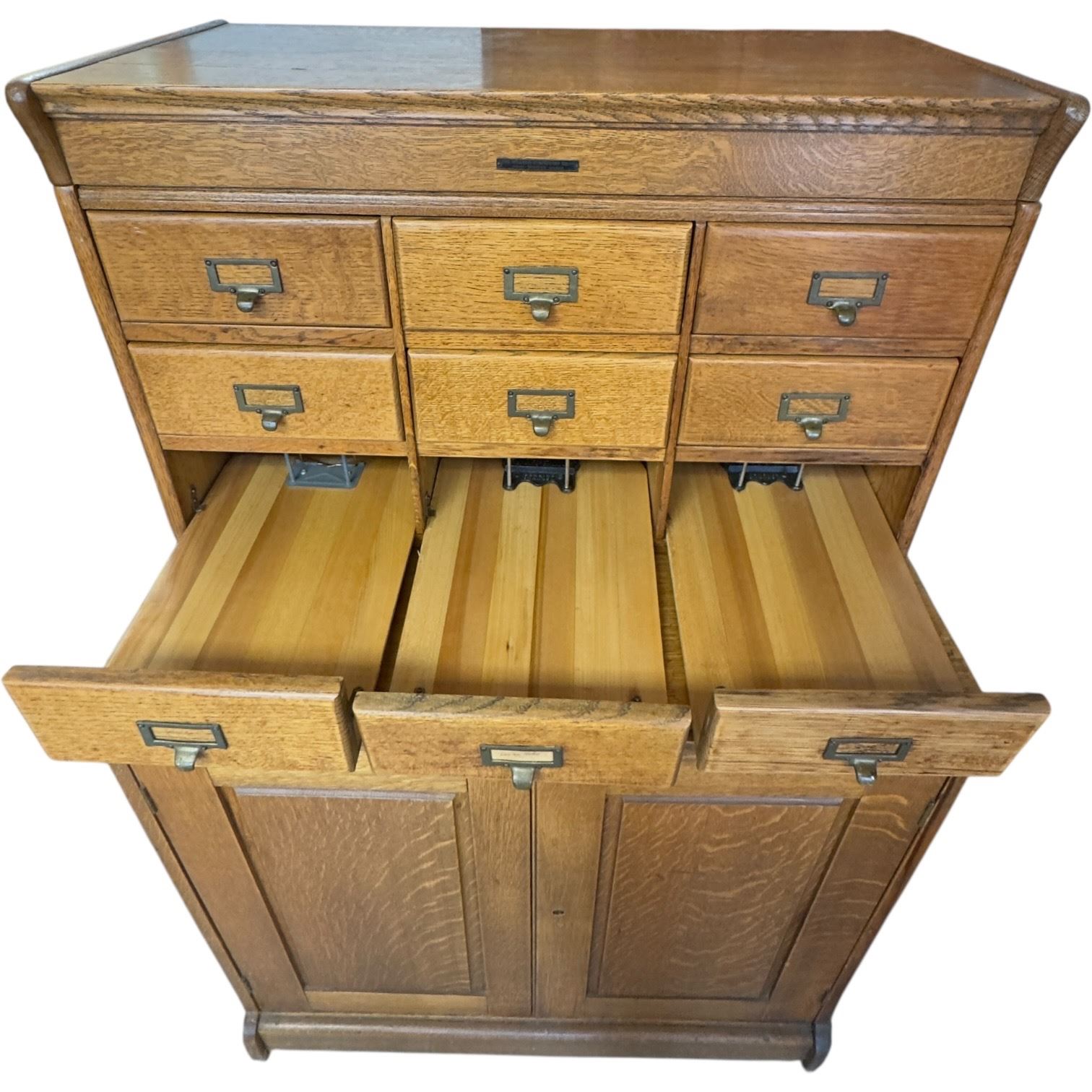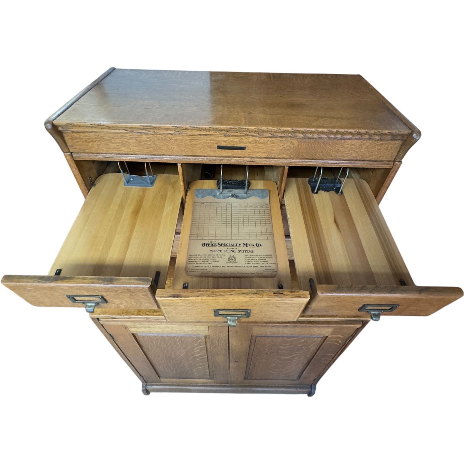 Wilson Stationary Company solid oak filing cabinet with two-piece design. Features pull-out writing platforms, multiple cabinets and drawers. Includes dimensions of 34x25x53.5 inches. Crafted from durable oak wood for functional storage and organization. Item is as pictured.