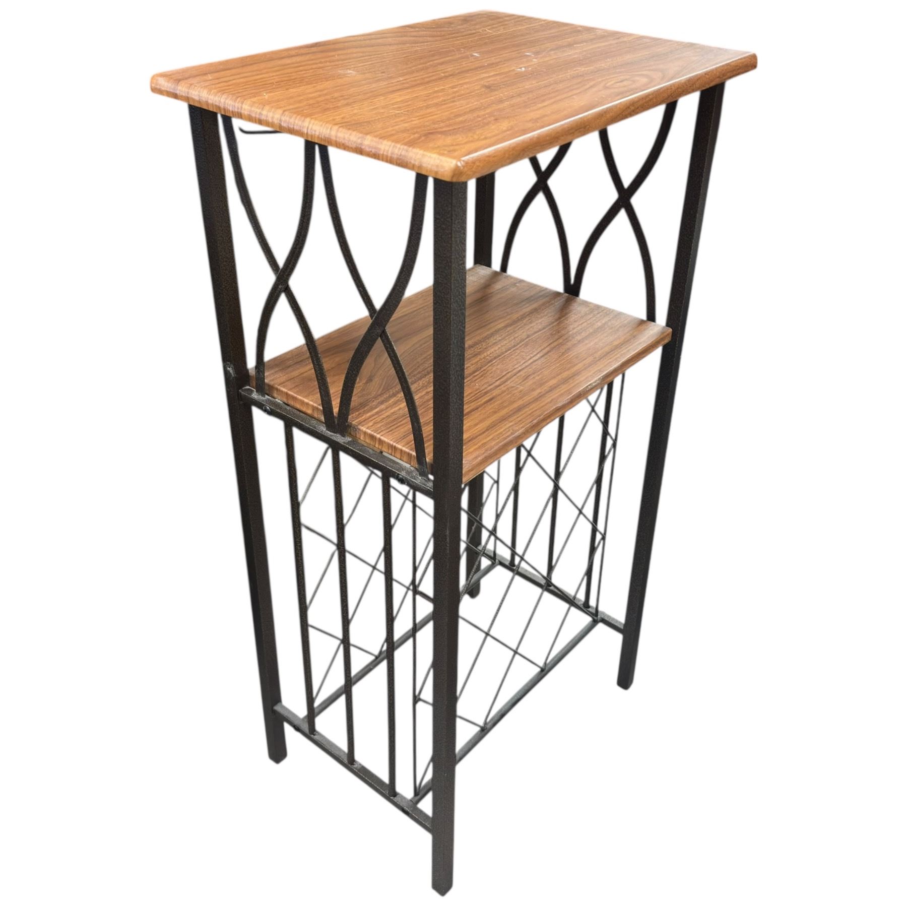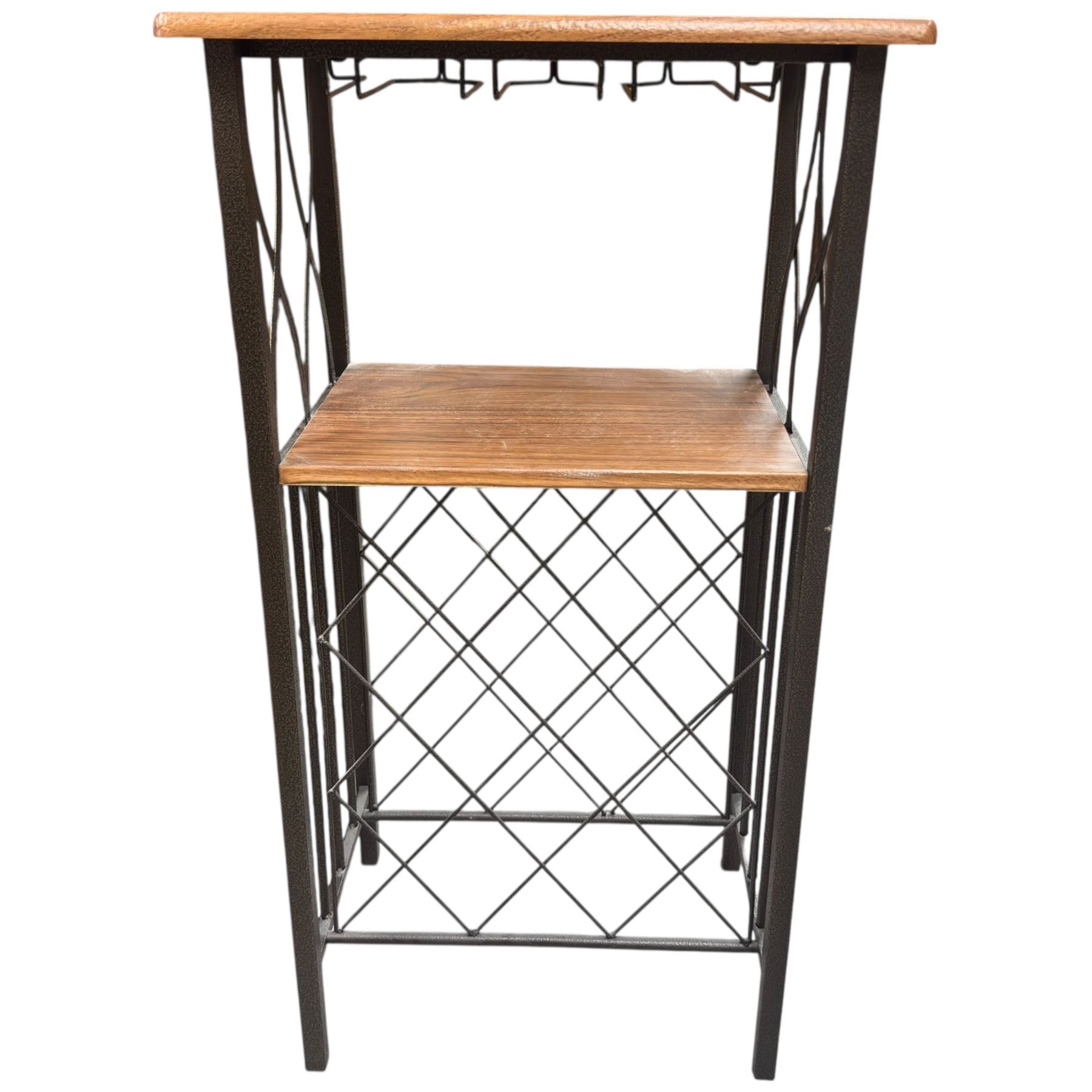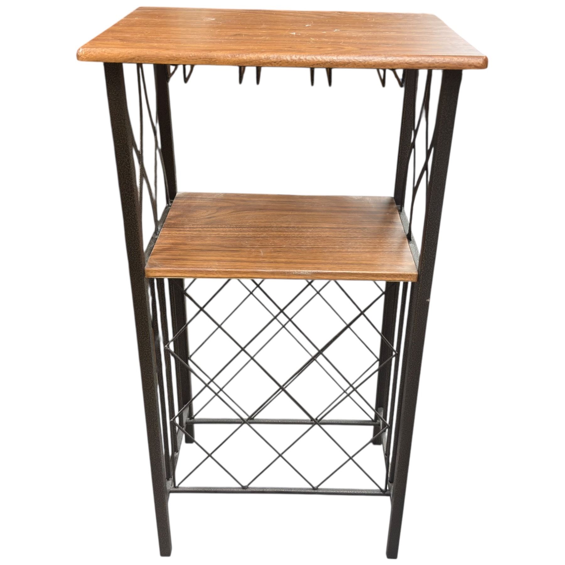Wine rack and wine glass storage nook featuring a faux wood top and metal construction. Dimensions are Length 14.5-Inch, Width 19.5-Inch, Height 36-Inch. Item is as pictured.