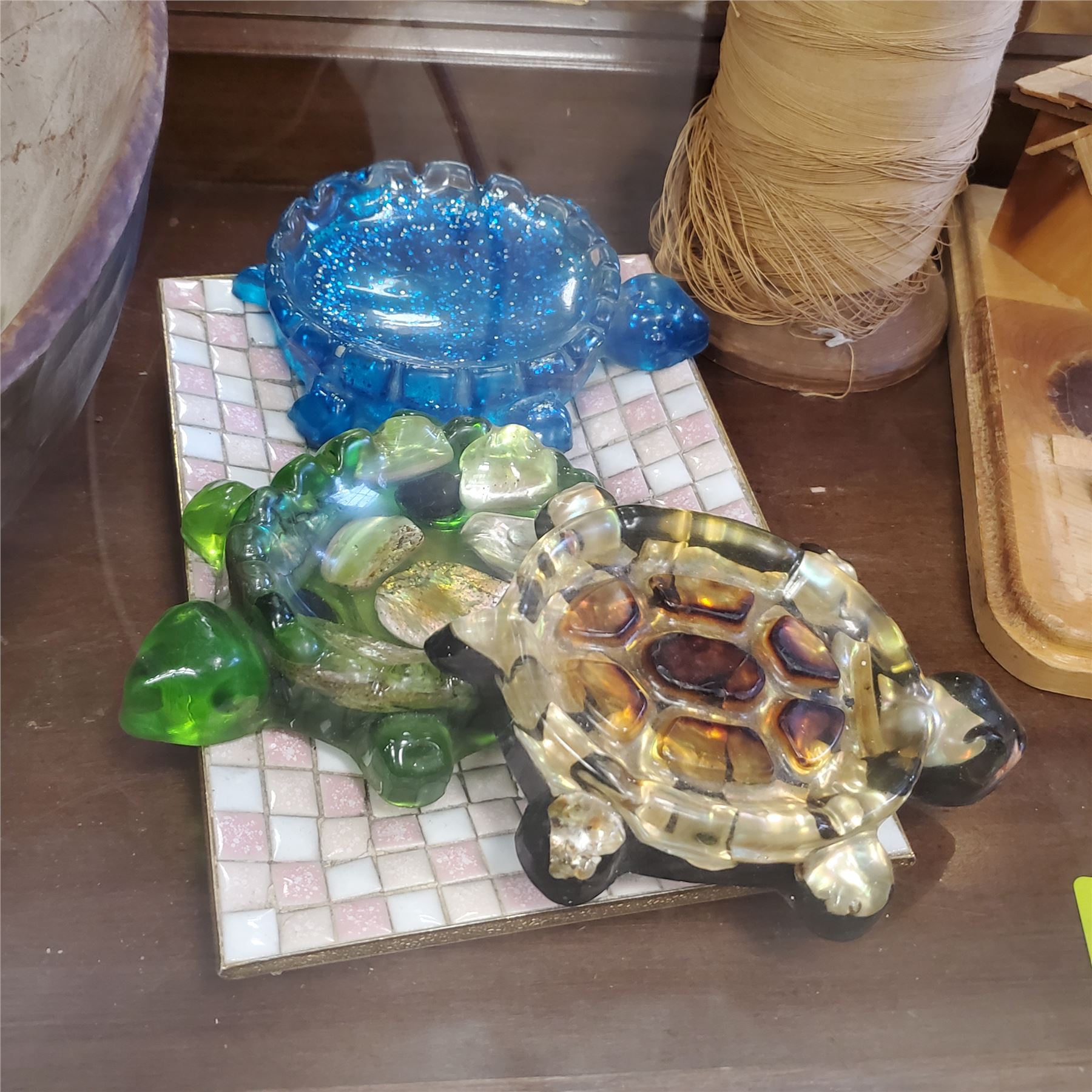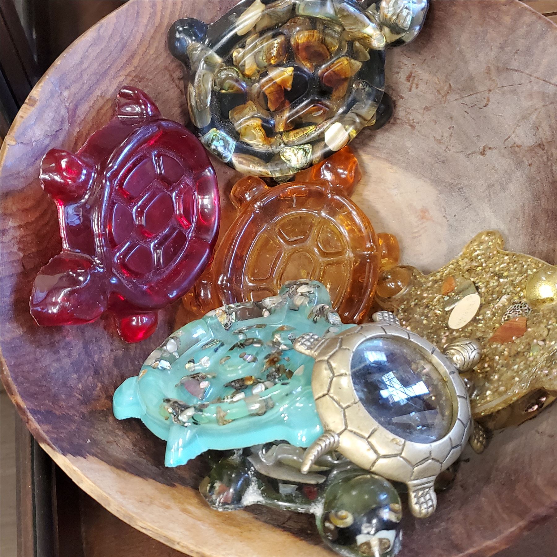 Collection includes Wondermold turtle-shaped soap trinket dishes, a wooden bowl, a mosaic plate, and a wood cabin piece. Each item reflects individual craftsmanship and materials. Item is as pictured.
