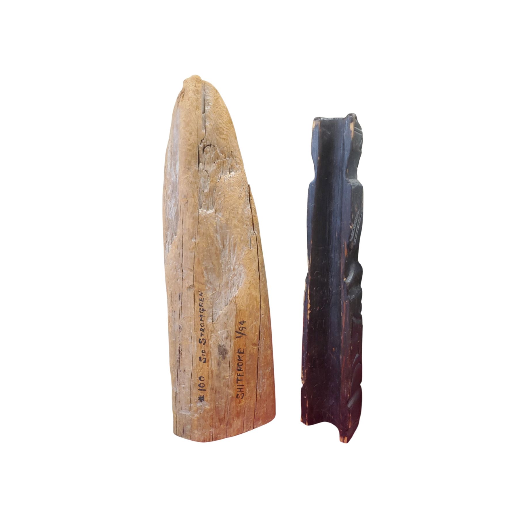 This lot includes a wood carved totem pole representing West Coast First Nations art, signed 1969 from Skeena BC and measuring 11-Inch tall. Additionally, it features art by Sid Stromgren known for his works inspired by indigenous motifs. Both pieces highlight traditional craftsmanship and cultural artistry.
