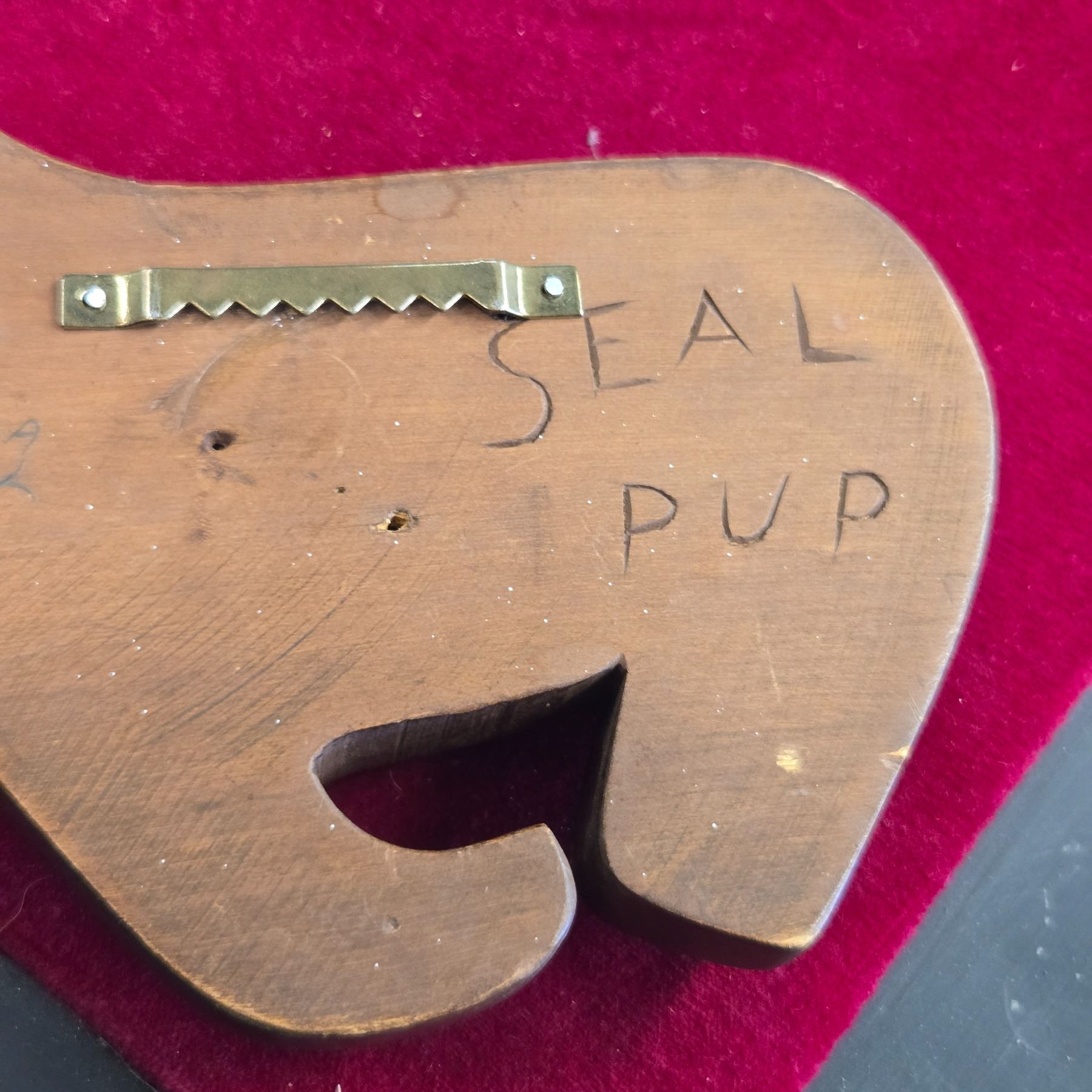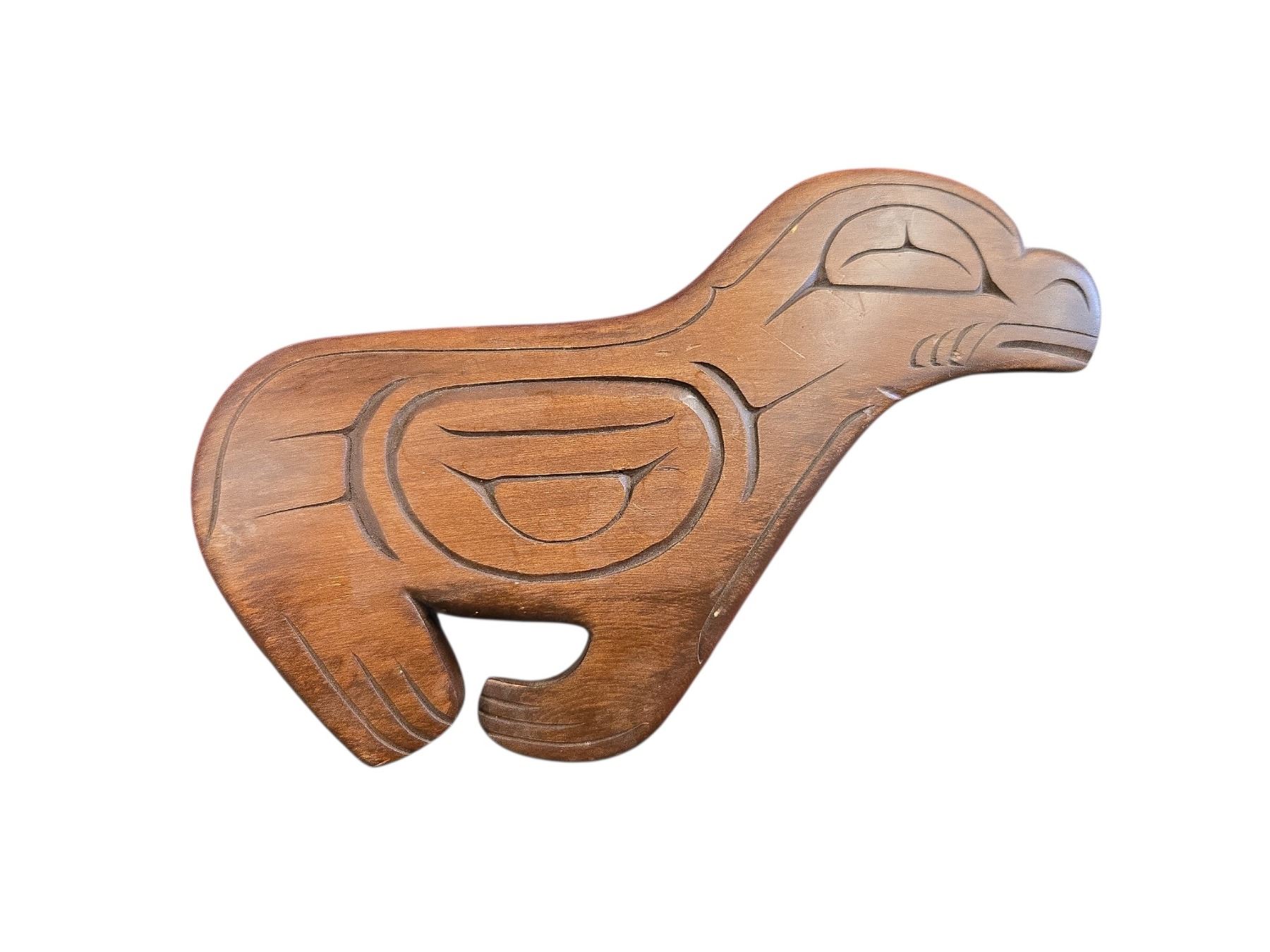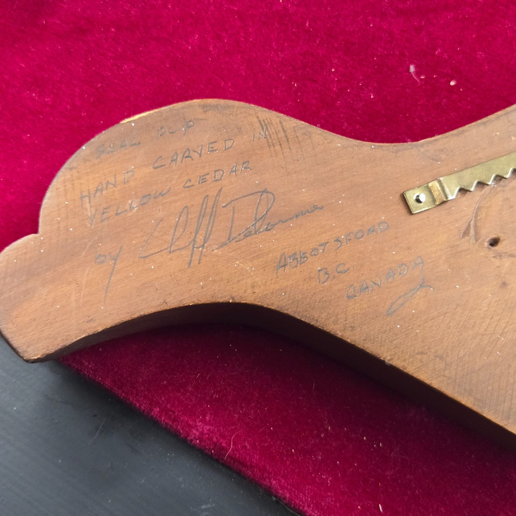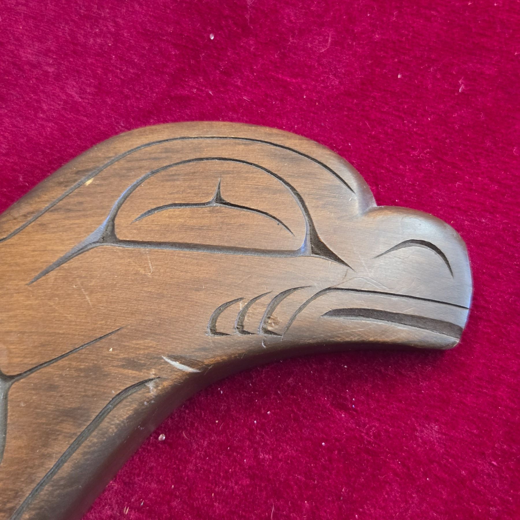 Wood relief carving depicting a Pacific Northwest seal, signed by First Nations artist Cliff Delorme. Measures 9-Inch long. Crafted in traditional style reflecting Indigenous heritage of the Pacific Northwest. Item is as pictured.