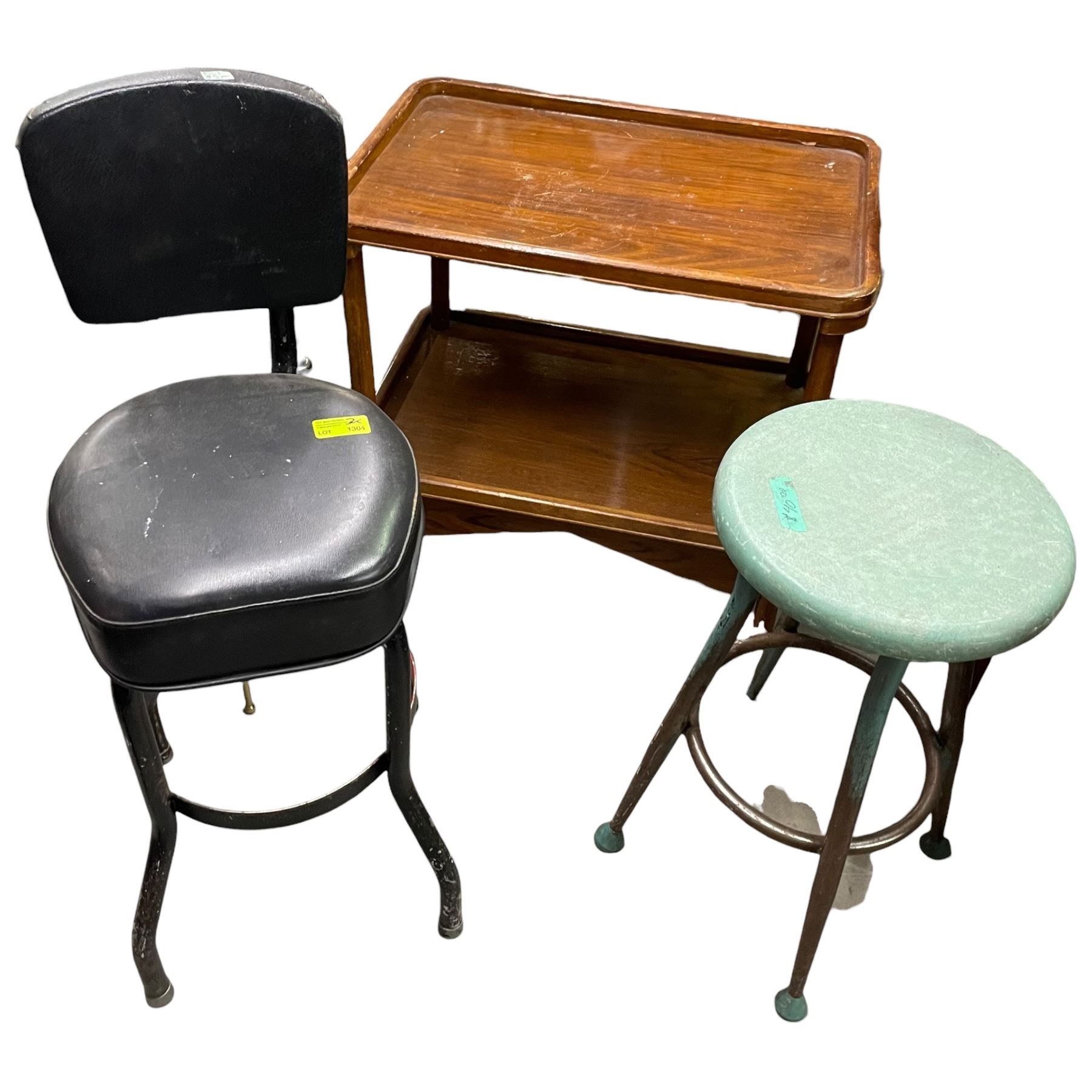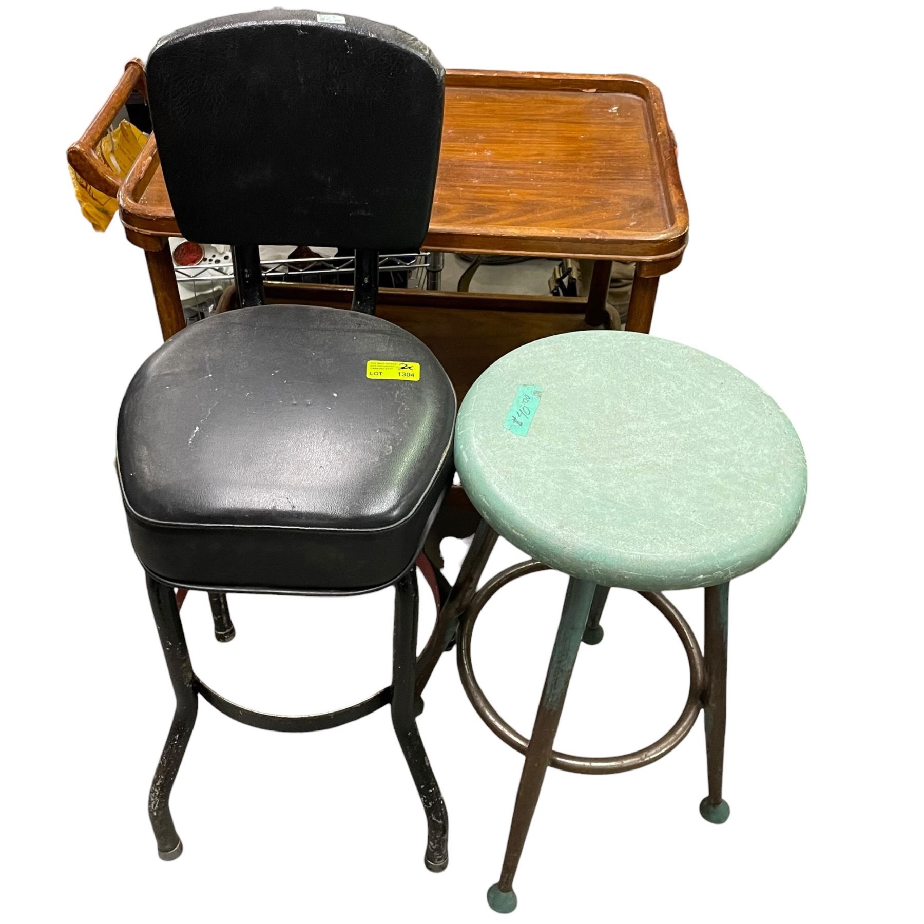 Wood Tea Caddy Cart and Two Metal Stools