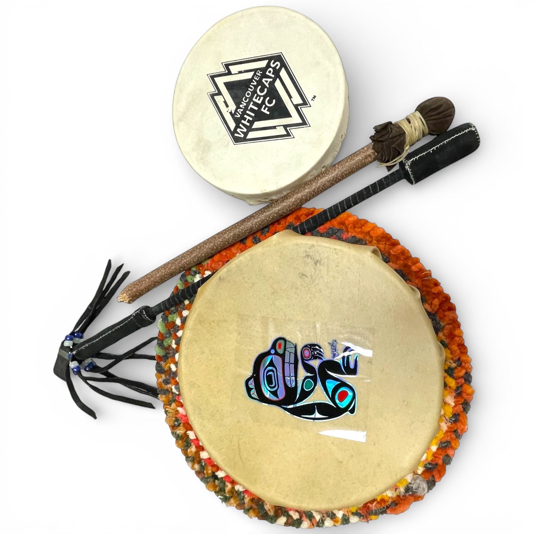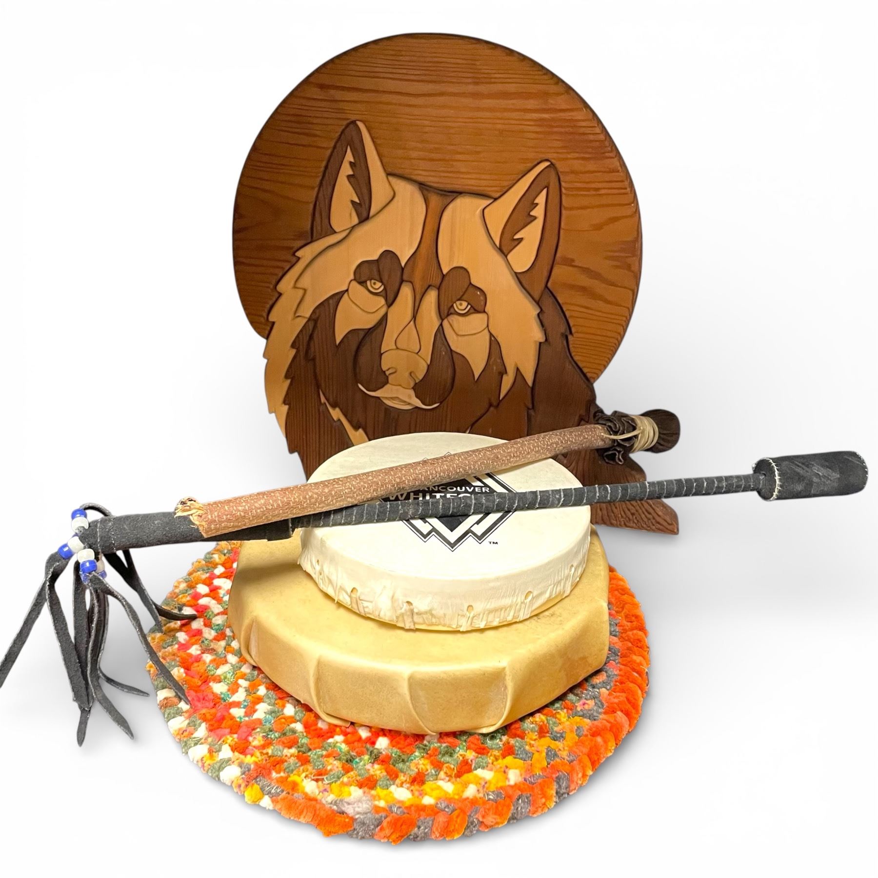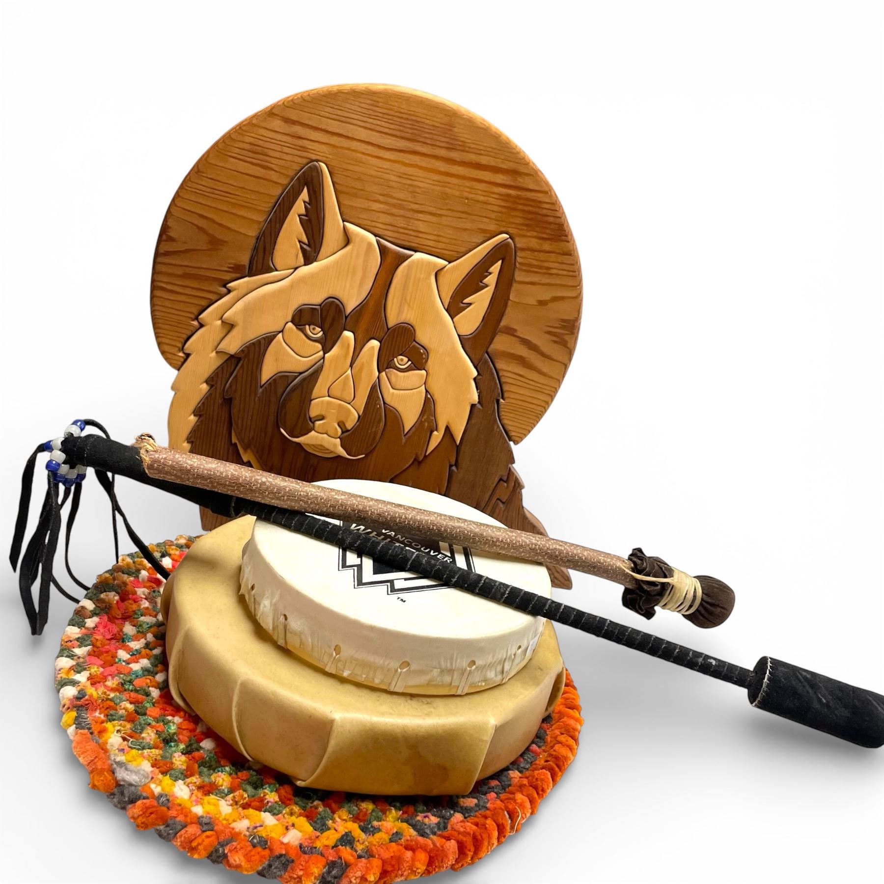 Wood Wolf Plaque, Rag Rug Mat and 2 Drums with Sticks (Mat is 13")