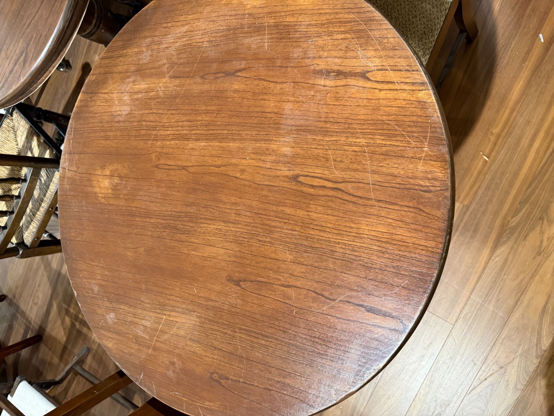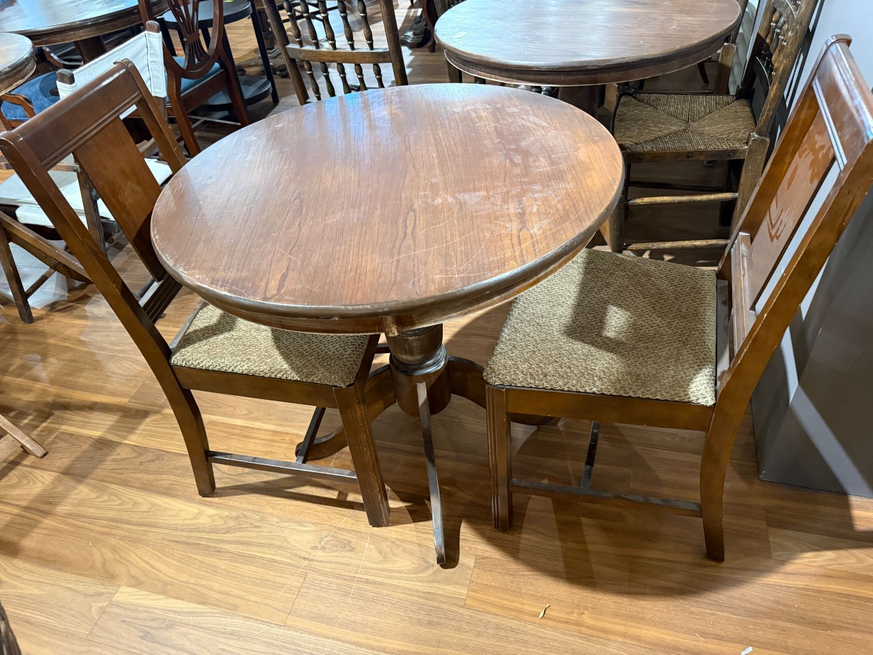 Wooden pub style dining set featuring a round top pedestal base table and two matching chairs. Table dimensions: Height 29.5-Inch, Diameter 31.5-Inch. Suitable for dining spaces or casual settings. The set is sturdy and compact with a classic design. Item is as pictured.