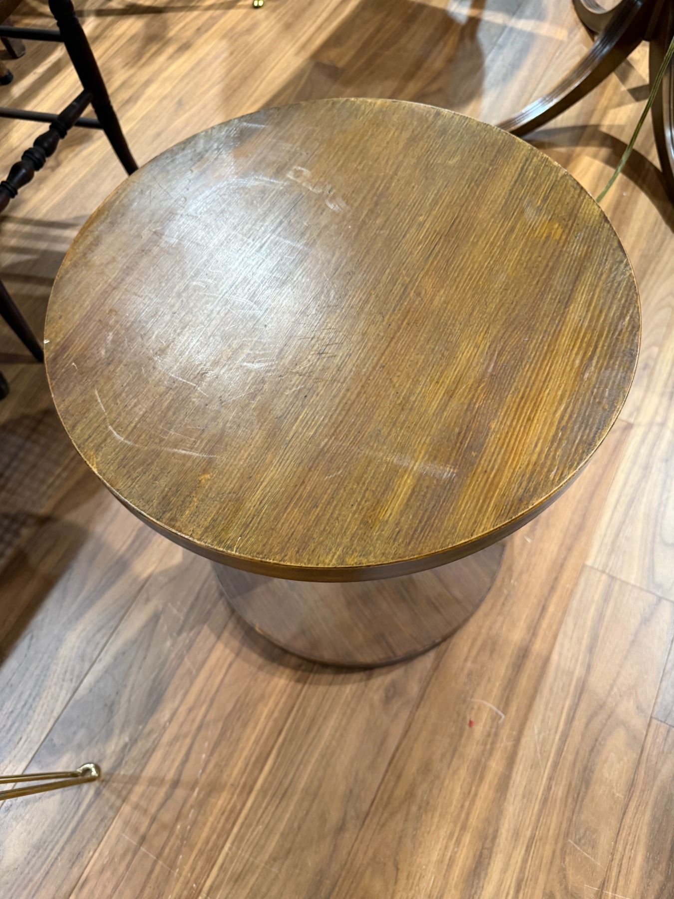 Wooden spool style small plant stand or side table featuring a height of 17-Inch and a diameter of 16-Inch. Designed with a rustic spool-inspired aesthetic. Versatile for use as a decorative plant stand or small side table. Item is as pictured.