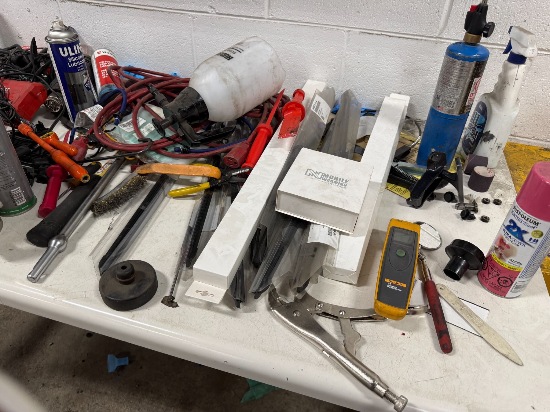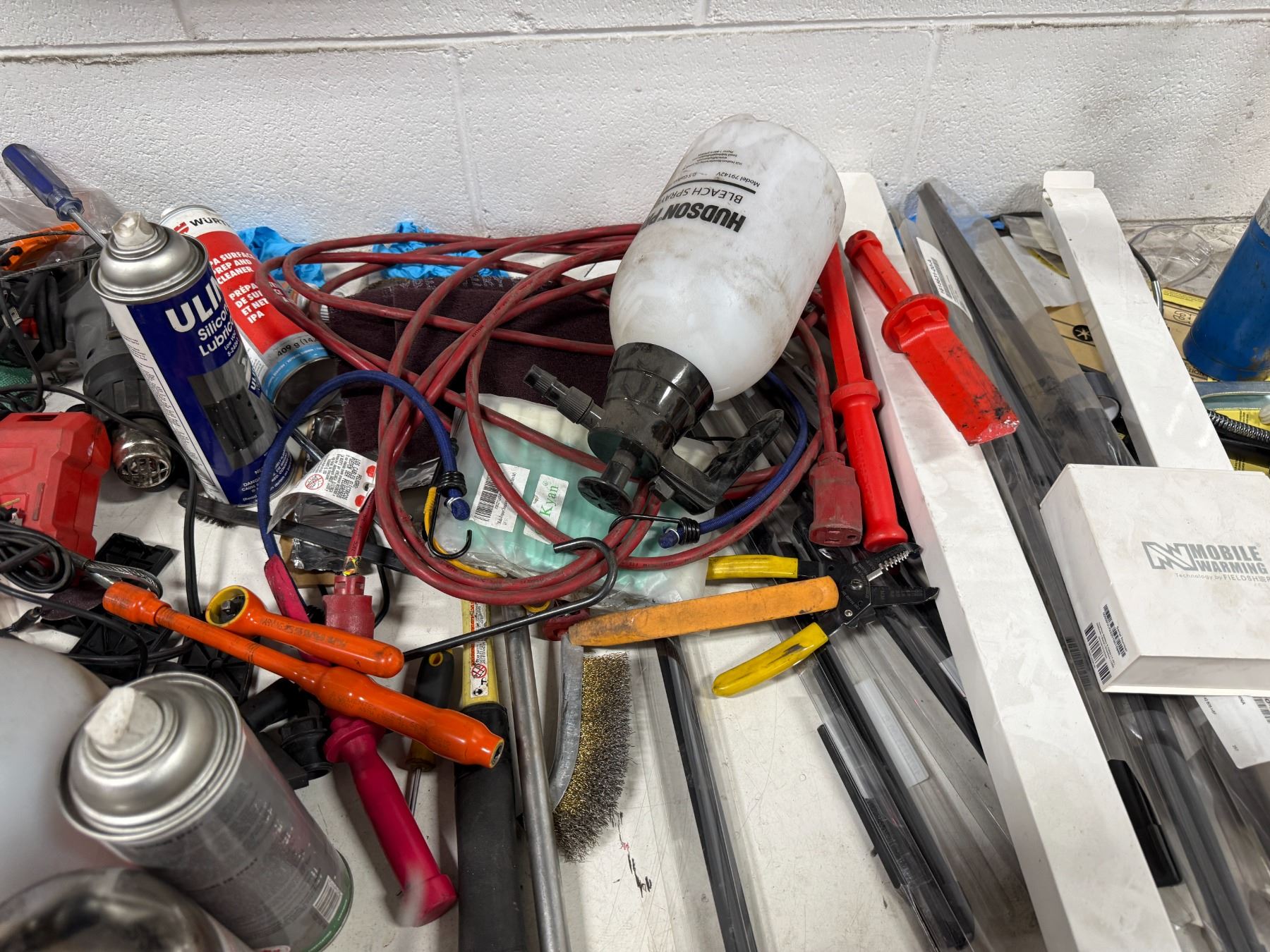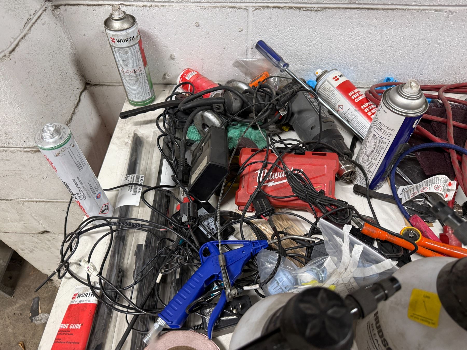 Workbench & contents including Milwaukee bits, air guns, wipers, hand tools, etc.