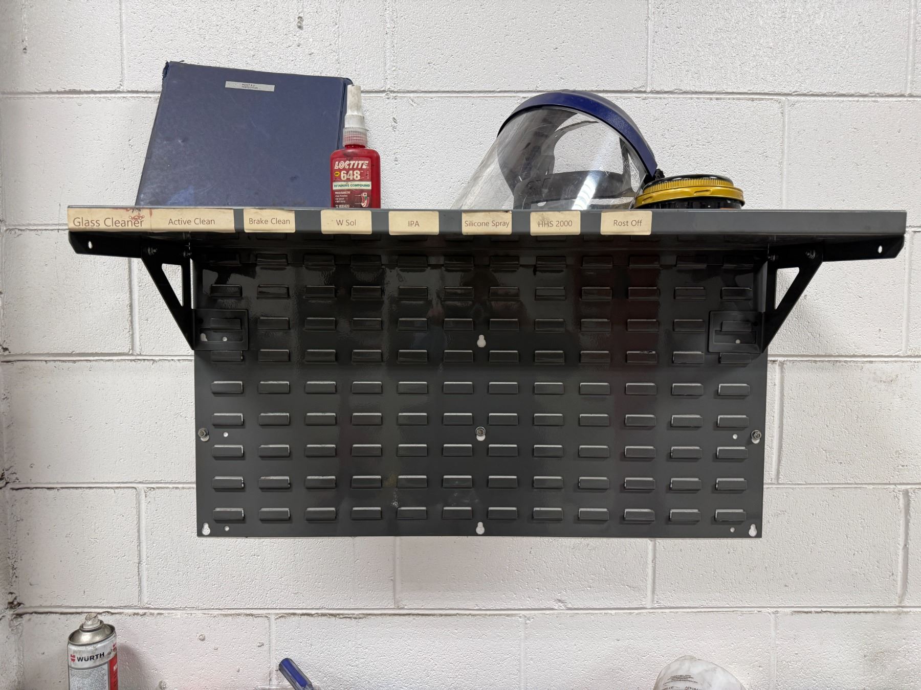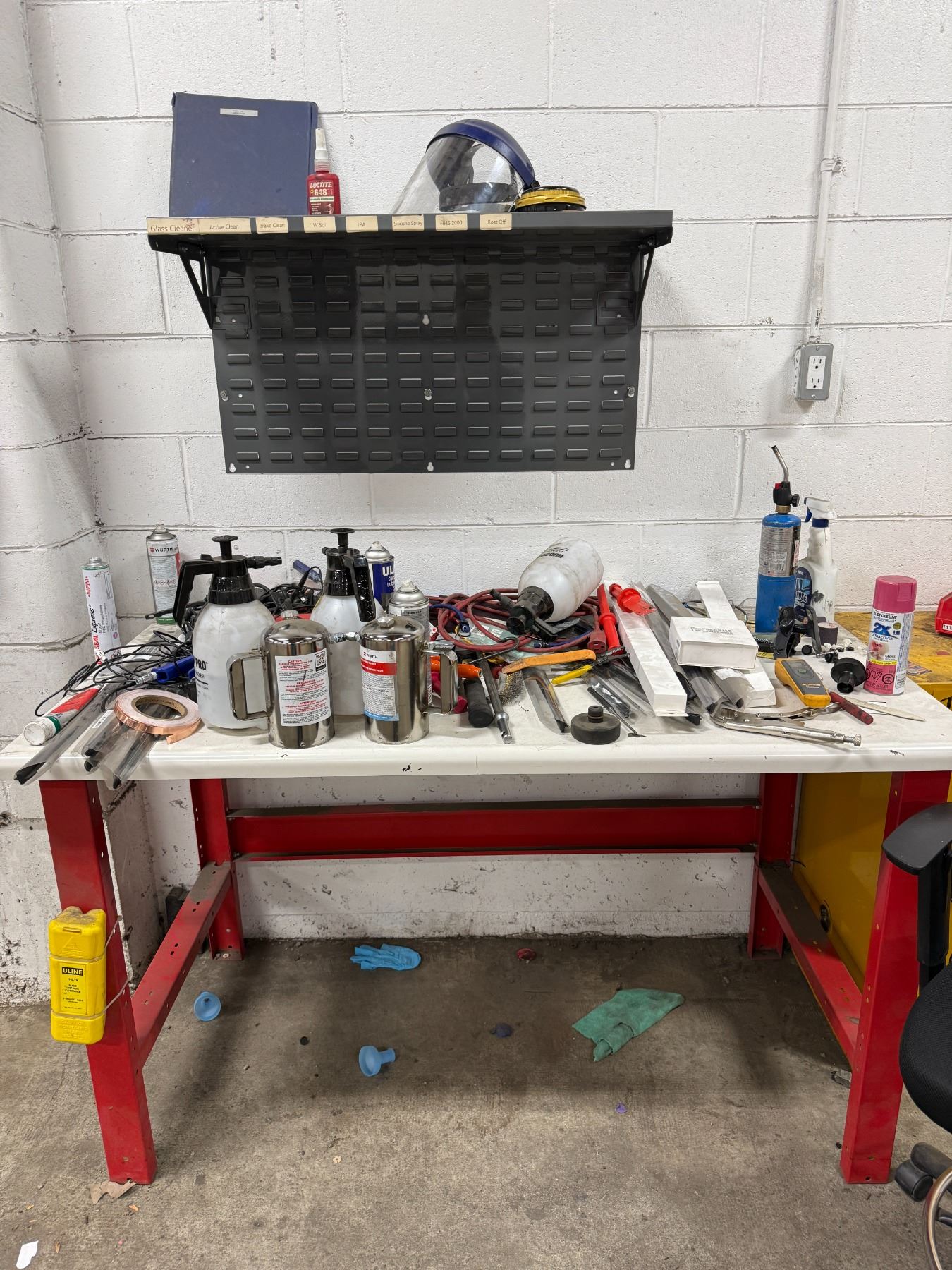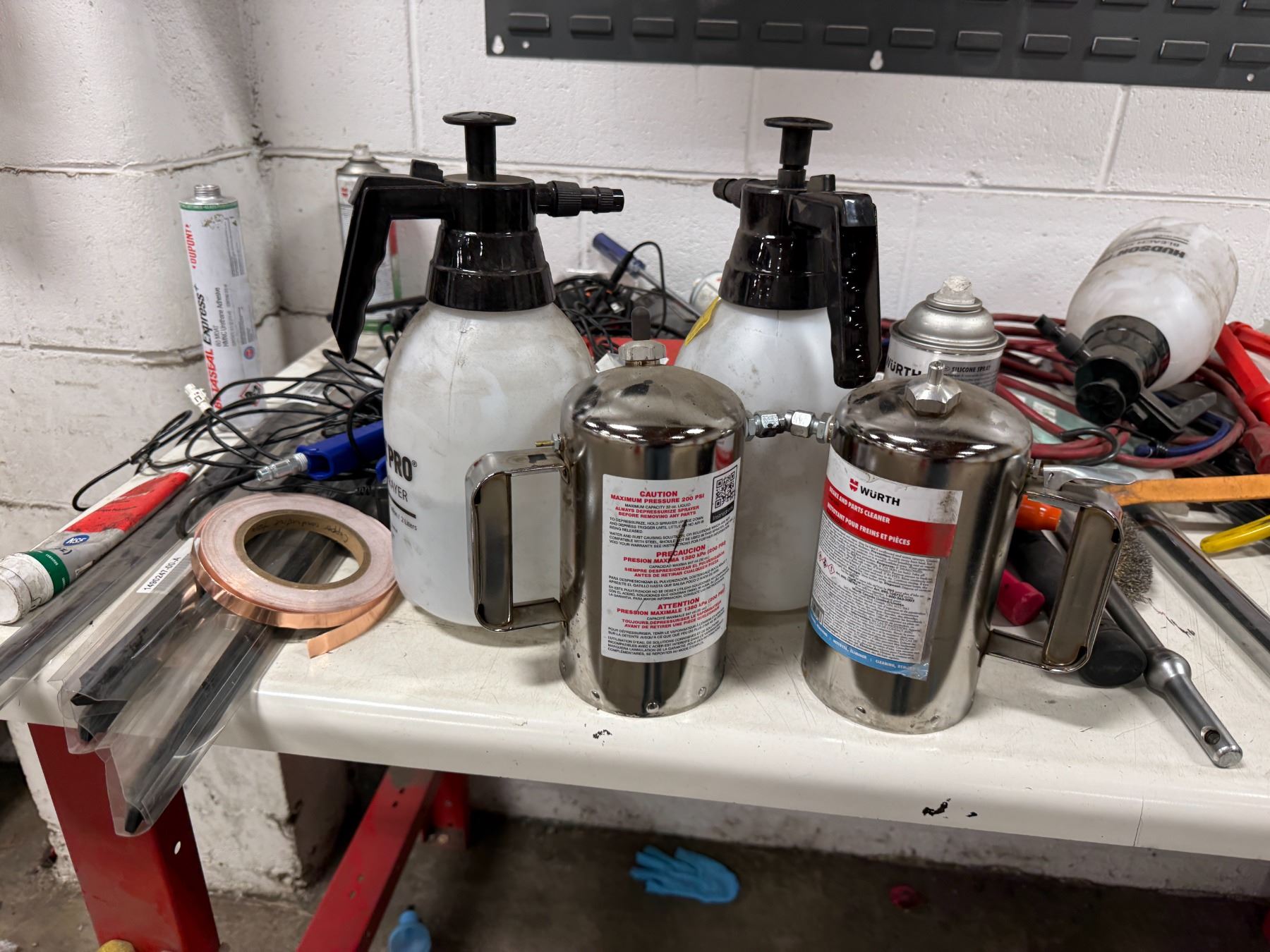 Workbench & contents including Milwaukee bits, air guns, wipers, hand tools, etc.