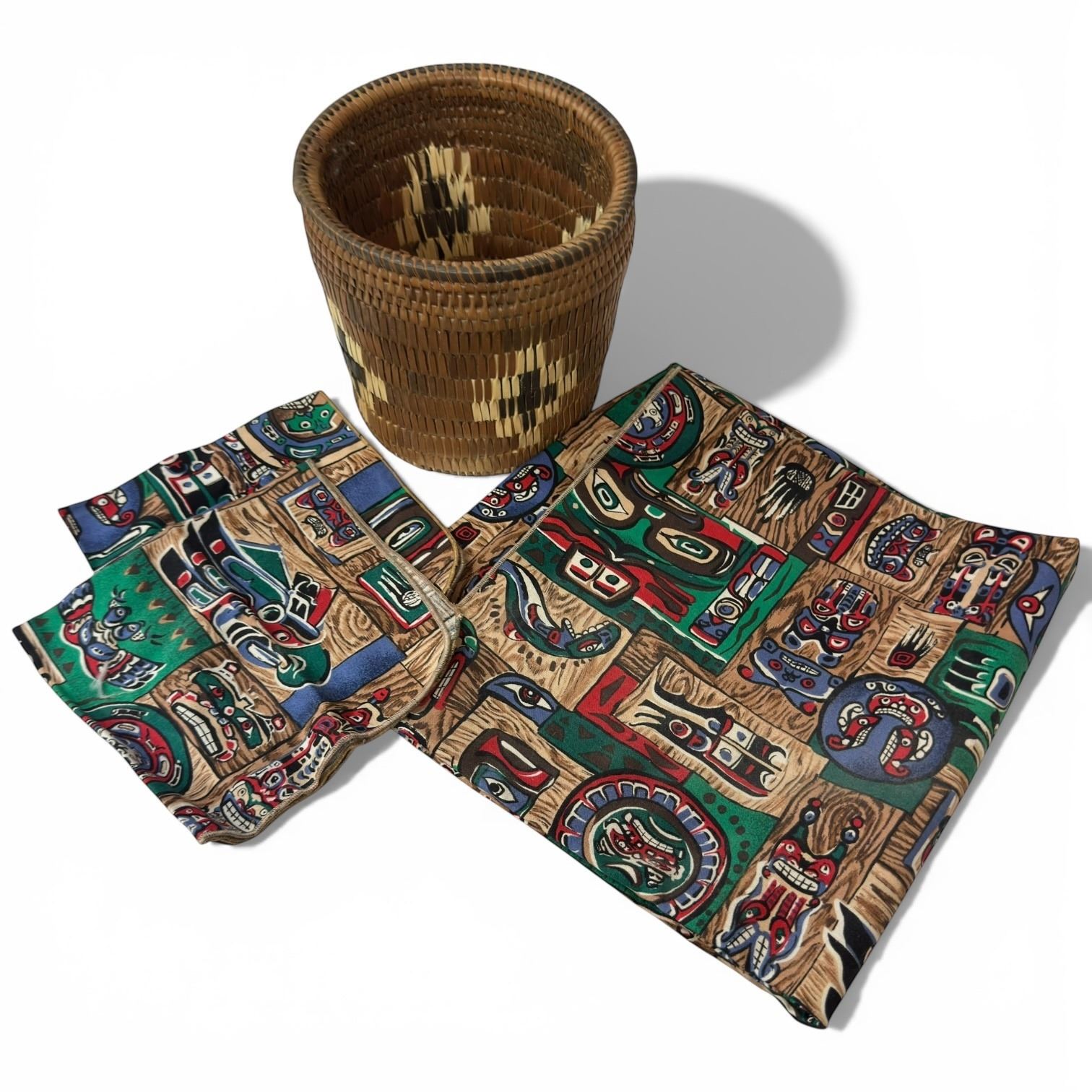Woven Basket with First Nations Design Table Cloth & 2 Napkins (80" x 60" table cloth)