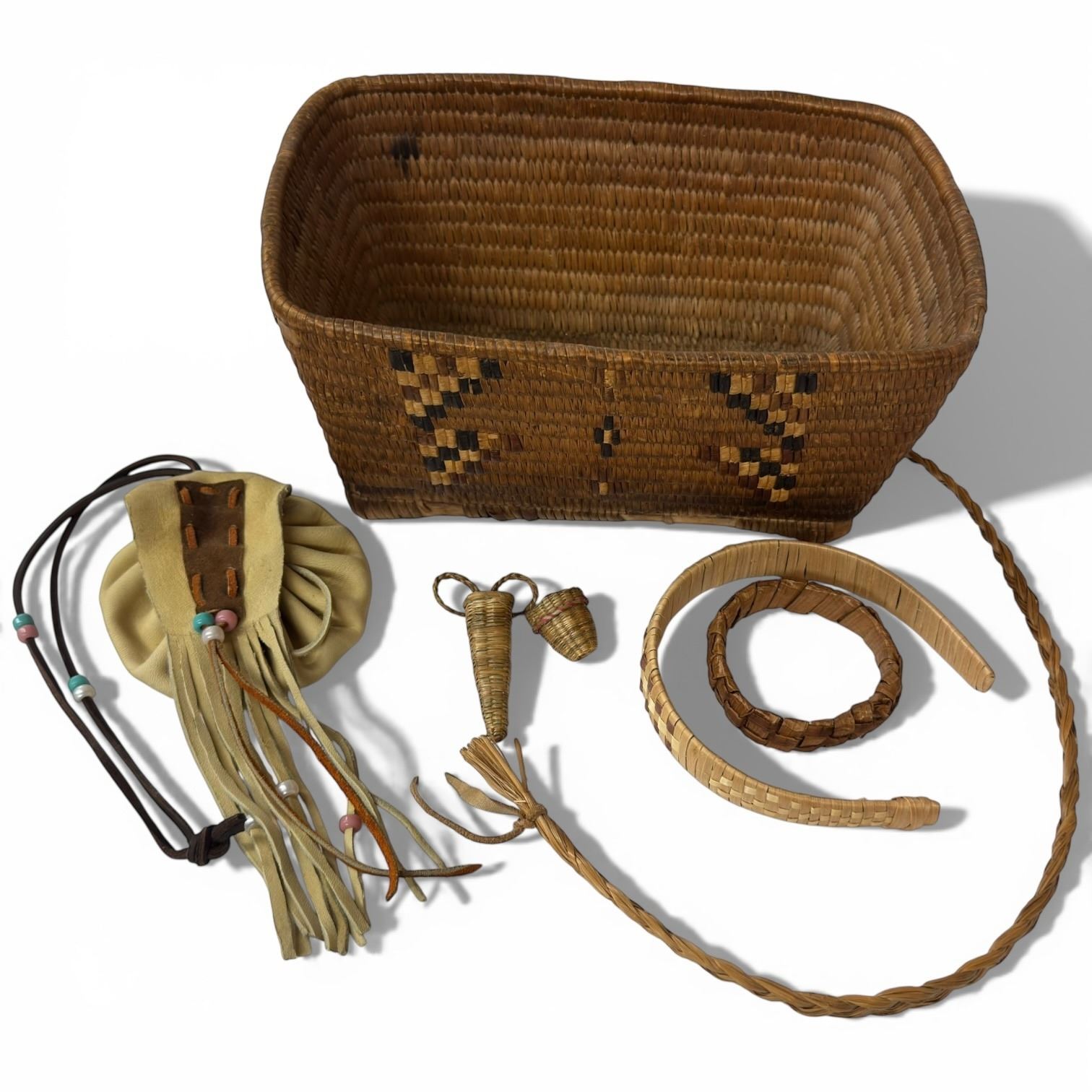 Woven Reed Basket with Assortment of First Nation Collectibles