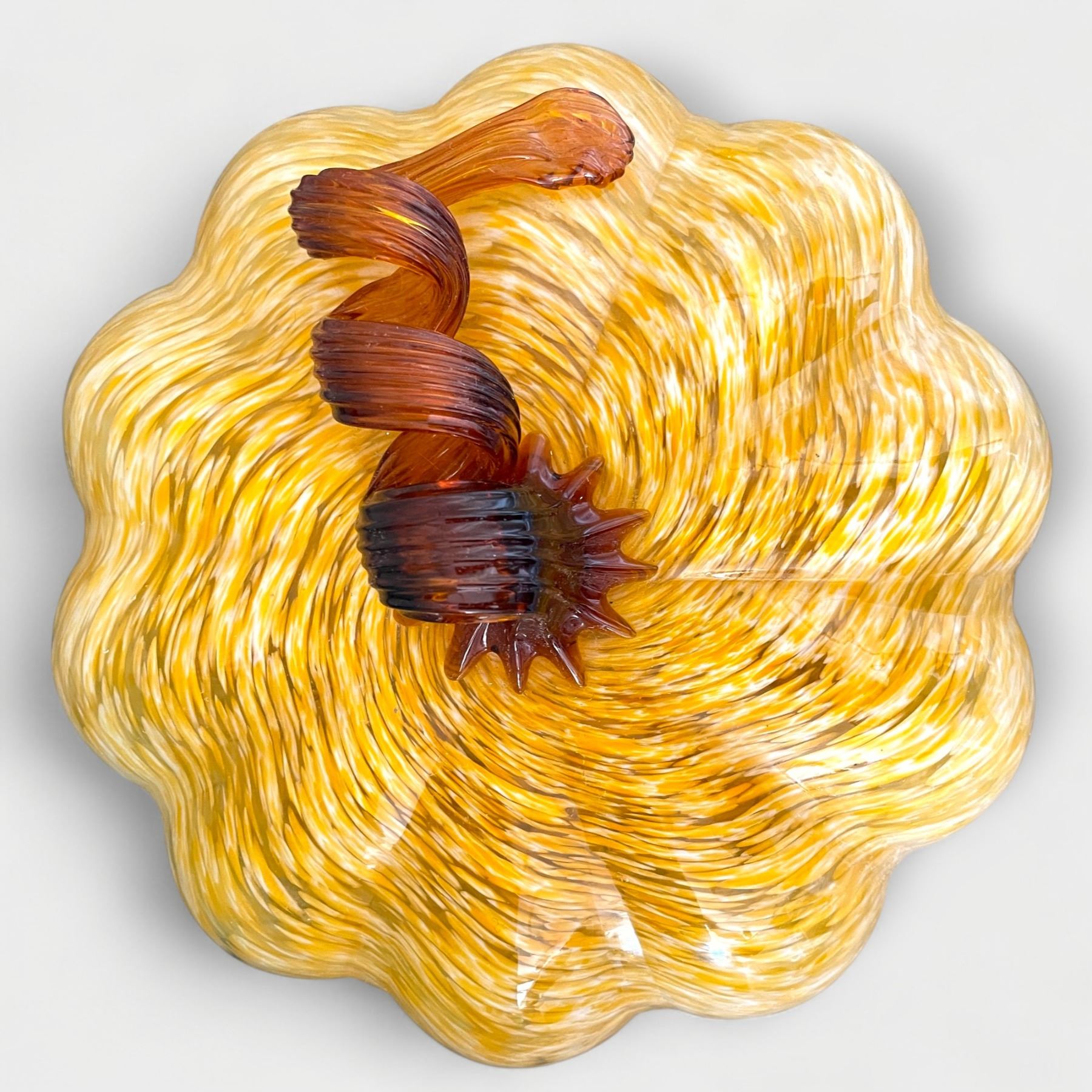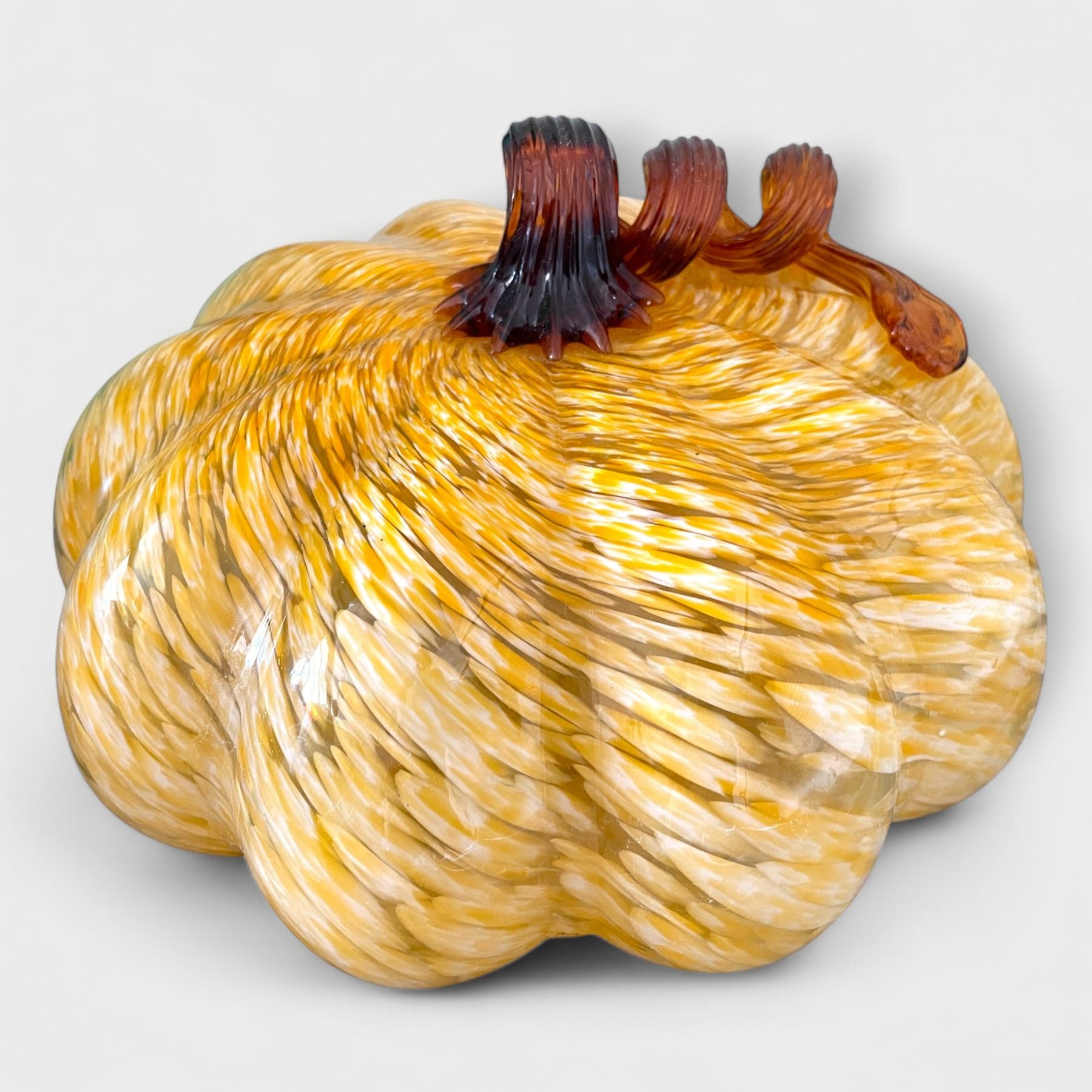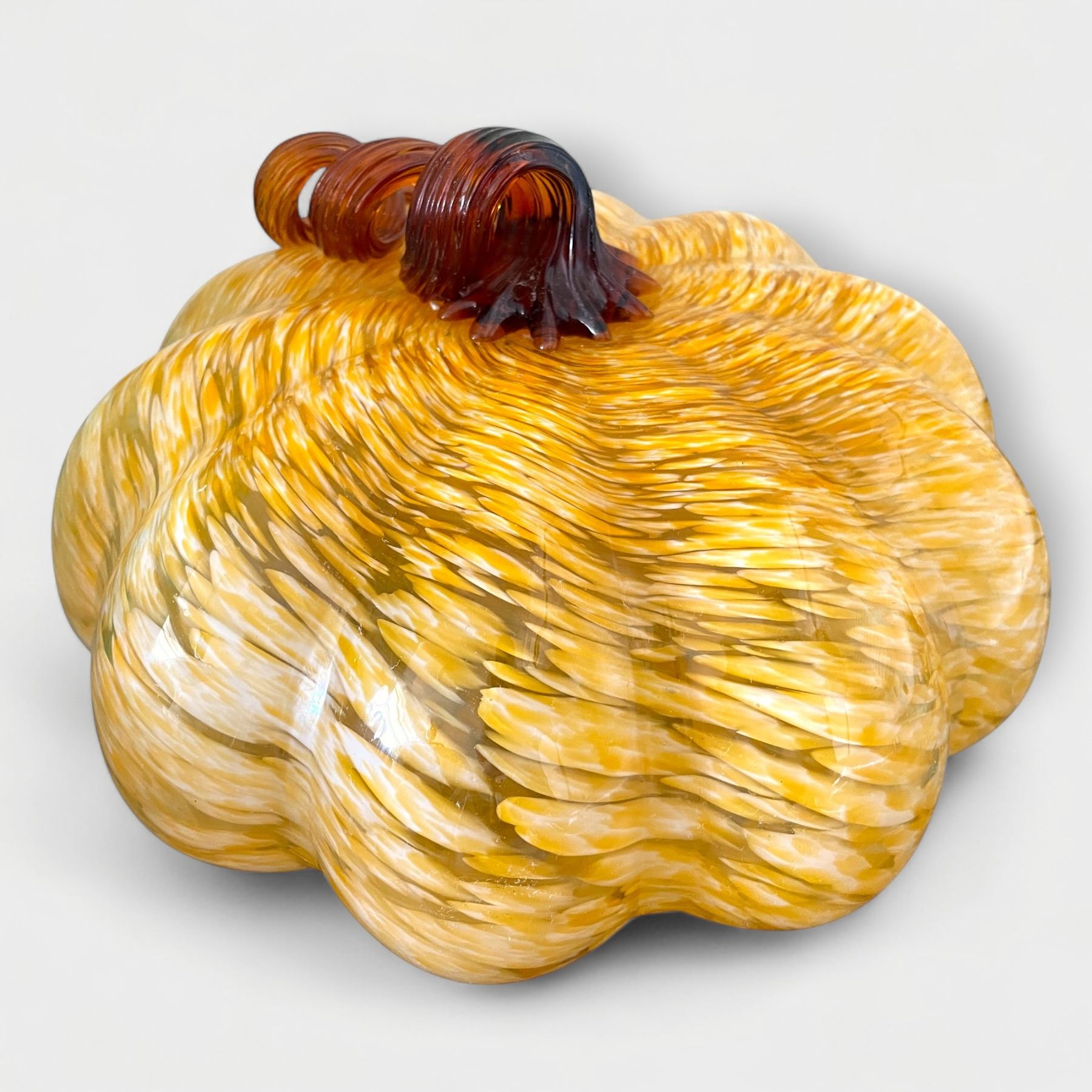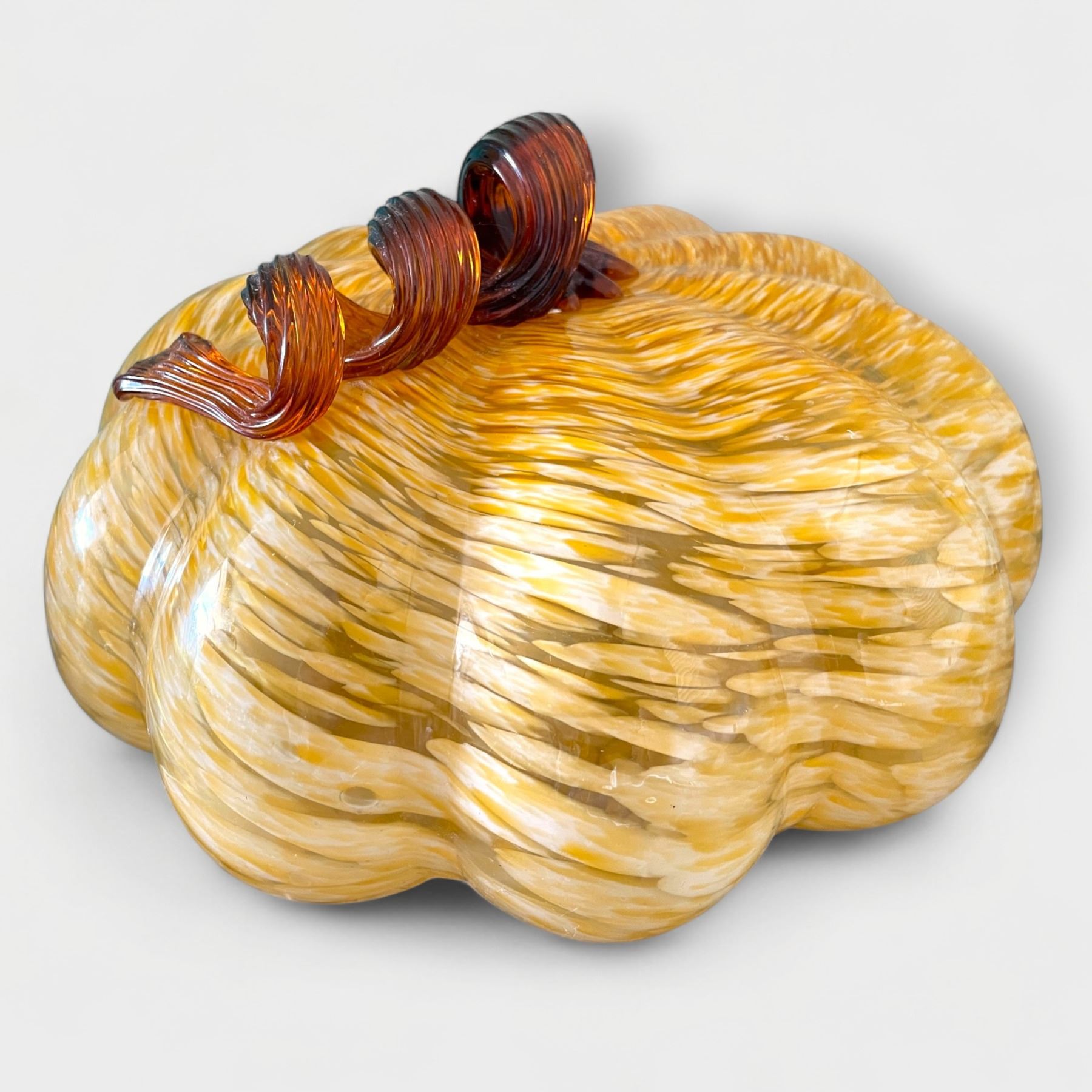 Yellow and Amber Art Glass Pumpkin - 11" diameter x 6" tall