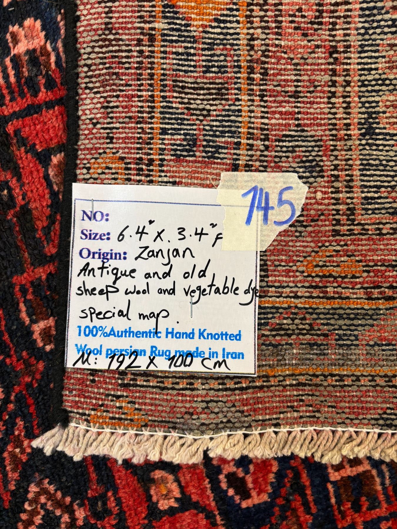 Zanjan 100% Authentic Hand Knotted Wool Persian Rug Handmade in Iran Antique and old Sheepwool and vegetable dye special map (These carpets have been washed professionally, and for this reason there are no tears or dirt in this carpet and it will be delivered to you clean and smooth. Don't miss the opportunity to buy such a carpet) 6.4'× 3.4'