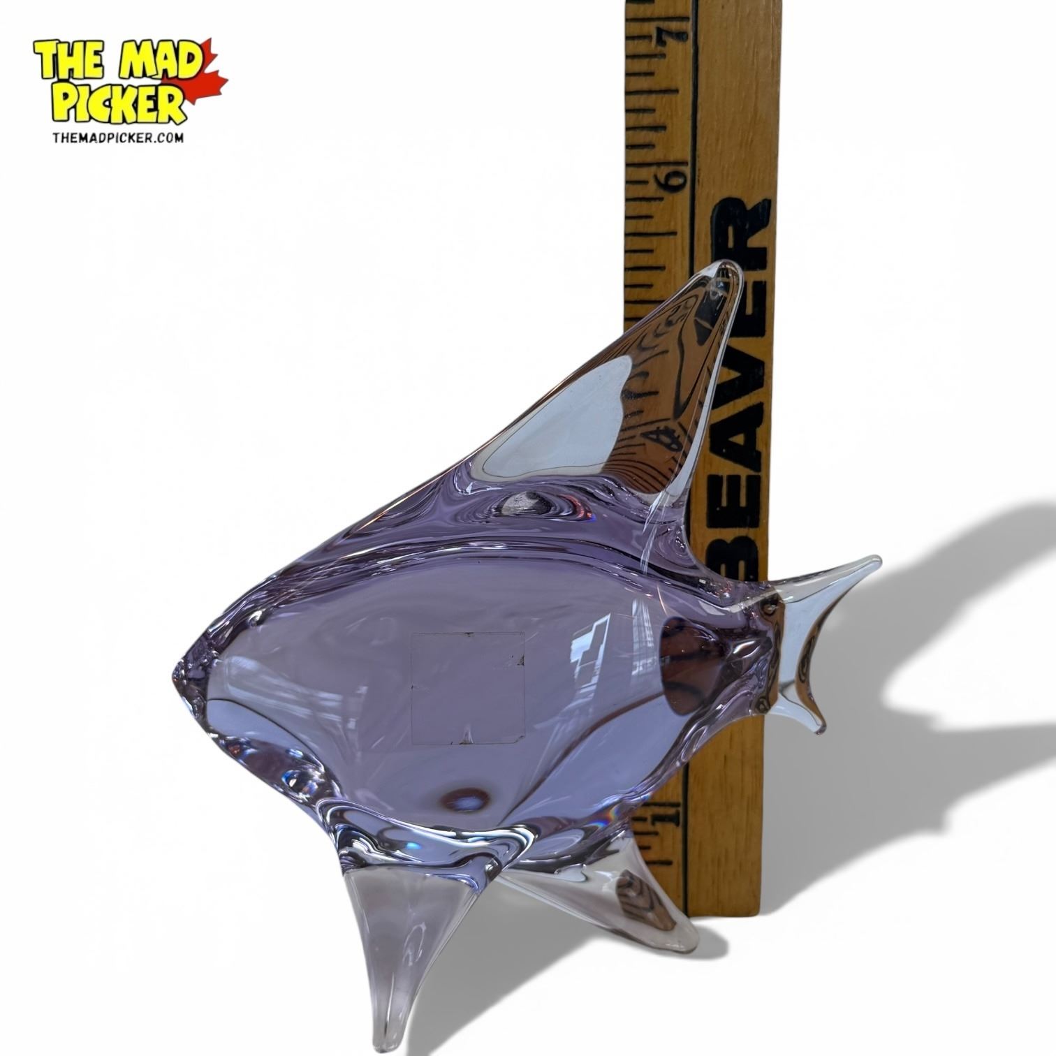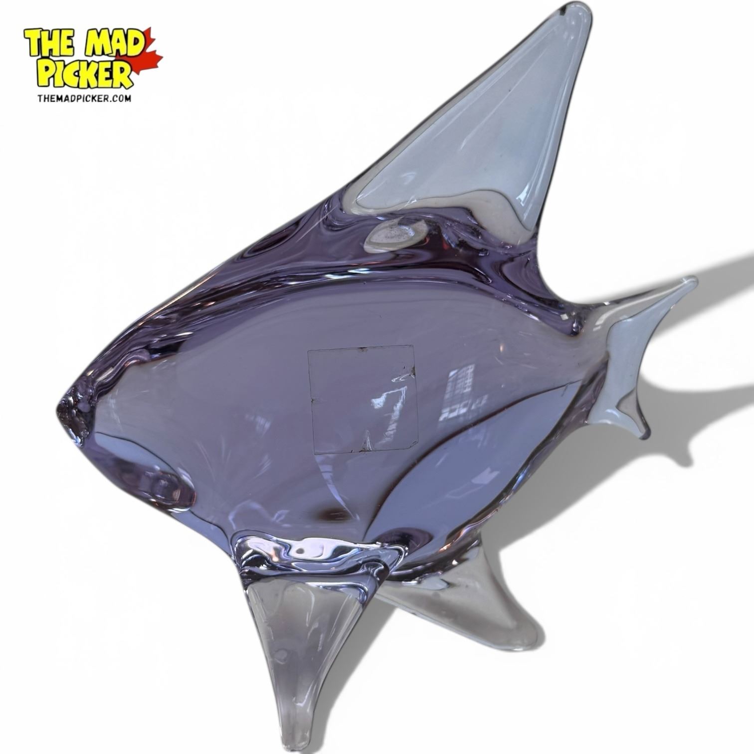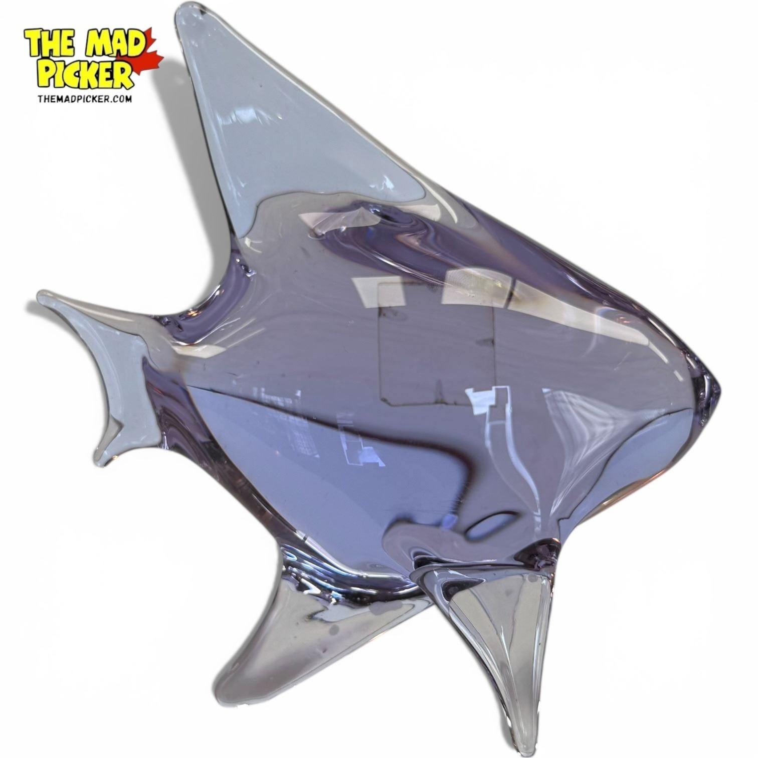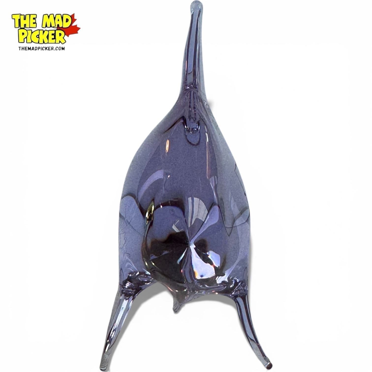 Neodymium glass fish figurine designed by Miloslav Janků for Železn� Brod Sklo in the 1960s. Bohemian art glass with color-changing properties, appearing lavender in natural light and blue under fluorescent light. Simple abstract form characteristic of mid-century modern design. Smoky clear finish.