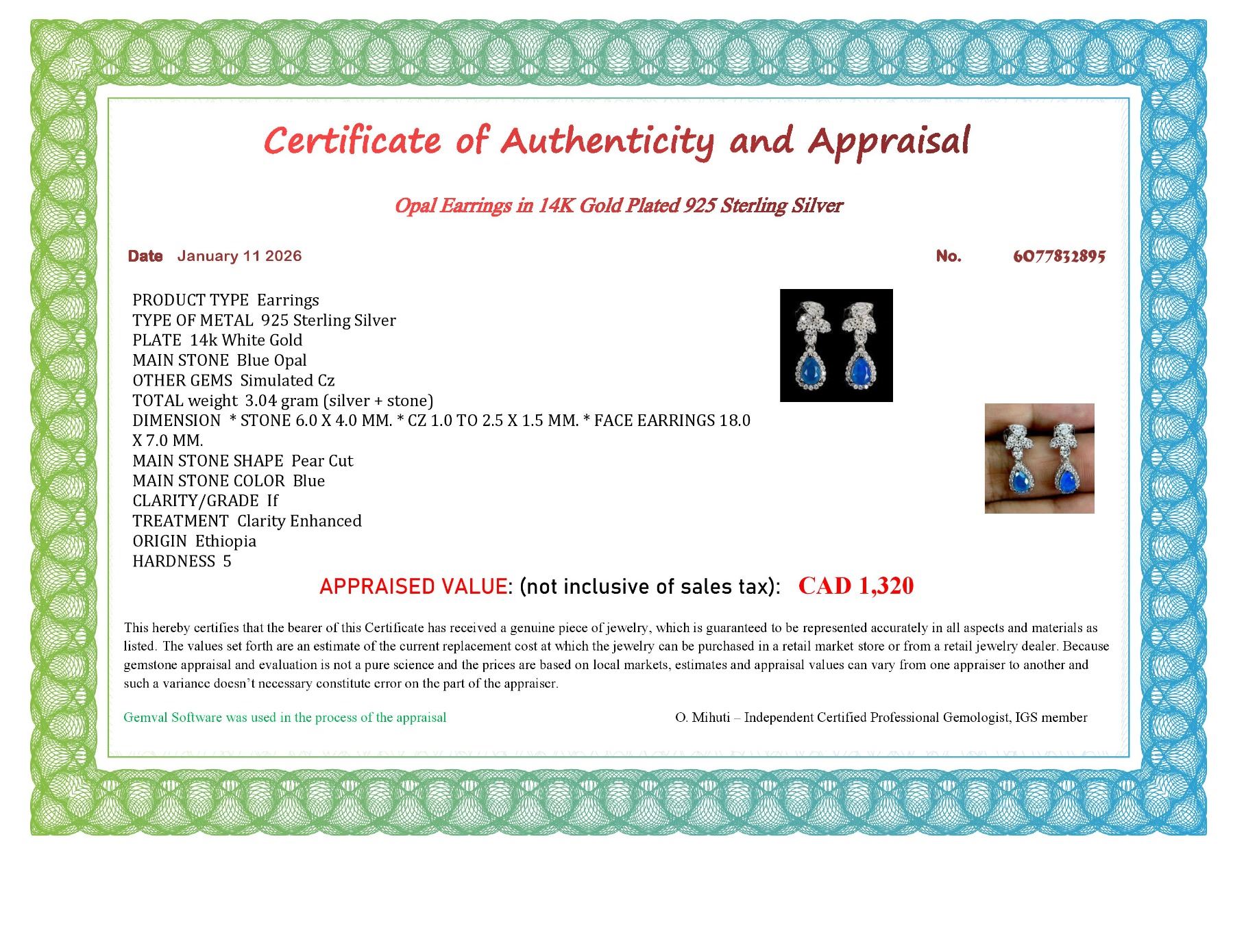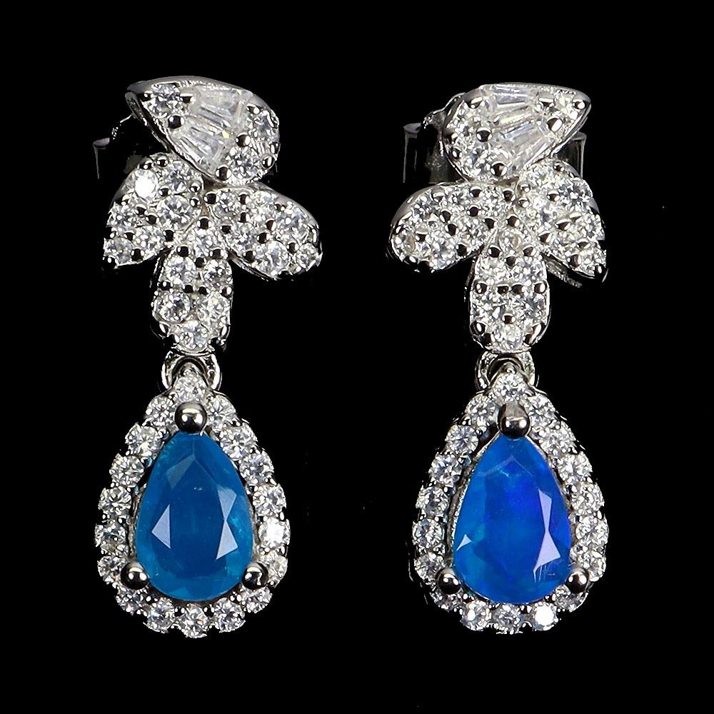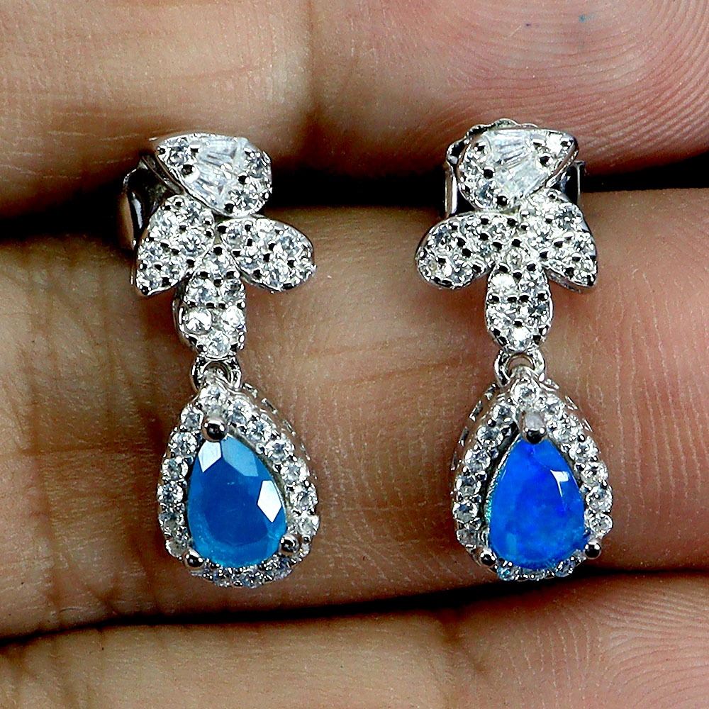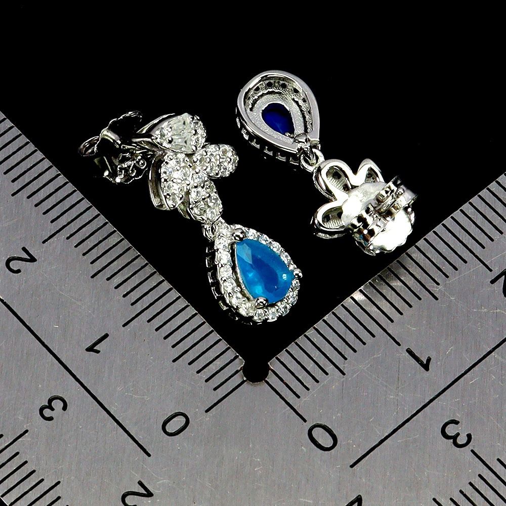 6X4 mm PEAR CUT BLUE OPAL EARRINGS IN 14K WHITE GOLD PLATED OVER 925 STERLING SILVER - APPRAISED REPLACEMENT VALUE CAD 1,320